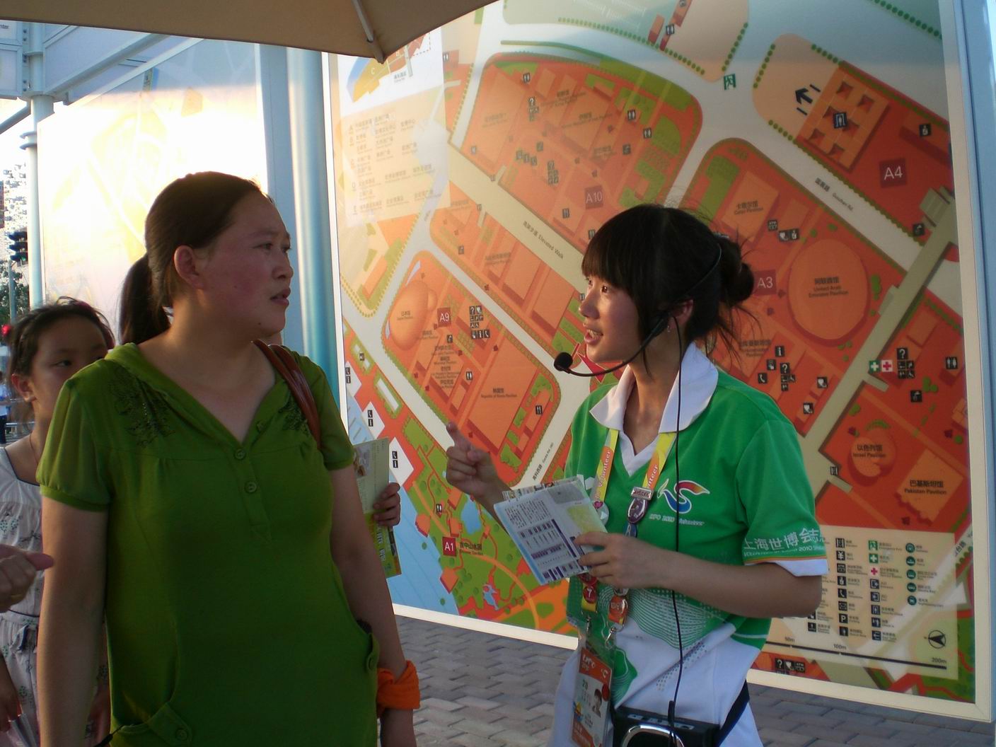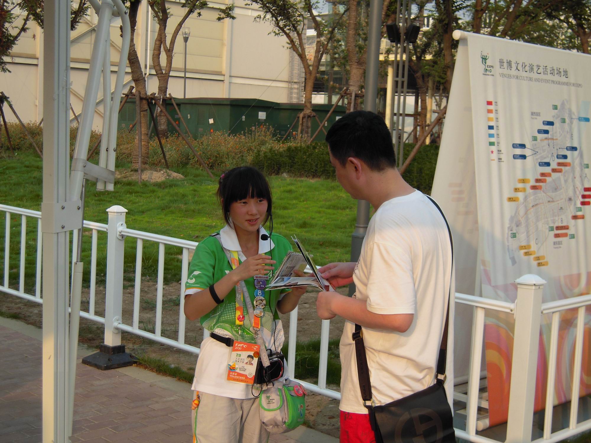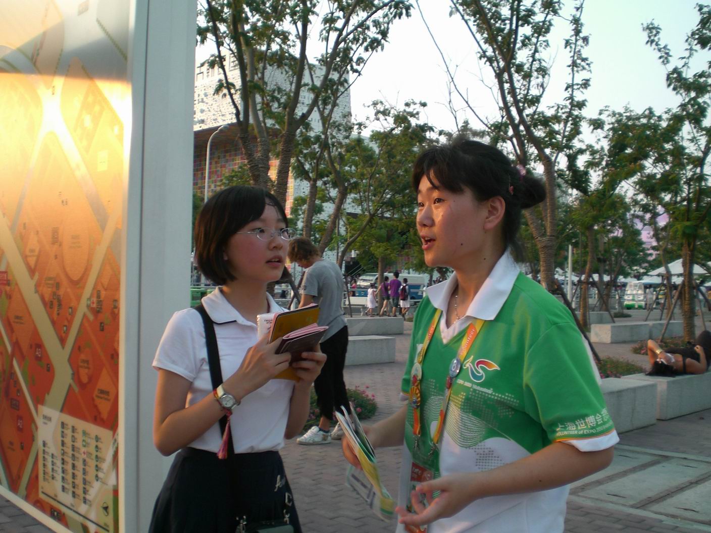 太阳如火如炉,气温节节攀升。小白菜们不畏高温日晒,坚守自己的岗位,电气女生志愿者更是巾帼不让须眉,玫瑰不让钢铁,表现出了她们刚毅的一面。 连日来烈日毫不留情地“烤”验着宋文婷、王亚同学,汗水争先恐后地跑出她们的体内。她们利用超强的忍耐力,发挥不怕苦不怕累的精神,坚守岗位,微笑服务八方来宾。随着周末假日的到来,进世博园参观的游客人数明显增加,小白菜们的工作量急剧上升。昔日里娇生惯养乖乖女,近日却是世博园里的耐火娃。宋文婷、王亚同学冒着酷暑,毫无怨言,竭诚尽力,服务游客。不信你向前问问看,无论你要去哪里她们都会用柔美的声音给你指示一条最为便捷的路线。在炙热的阳光下,她们仍继续绽放着阳光般的笑容,为游客们提供优质的服务。