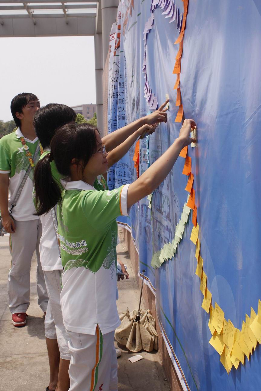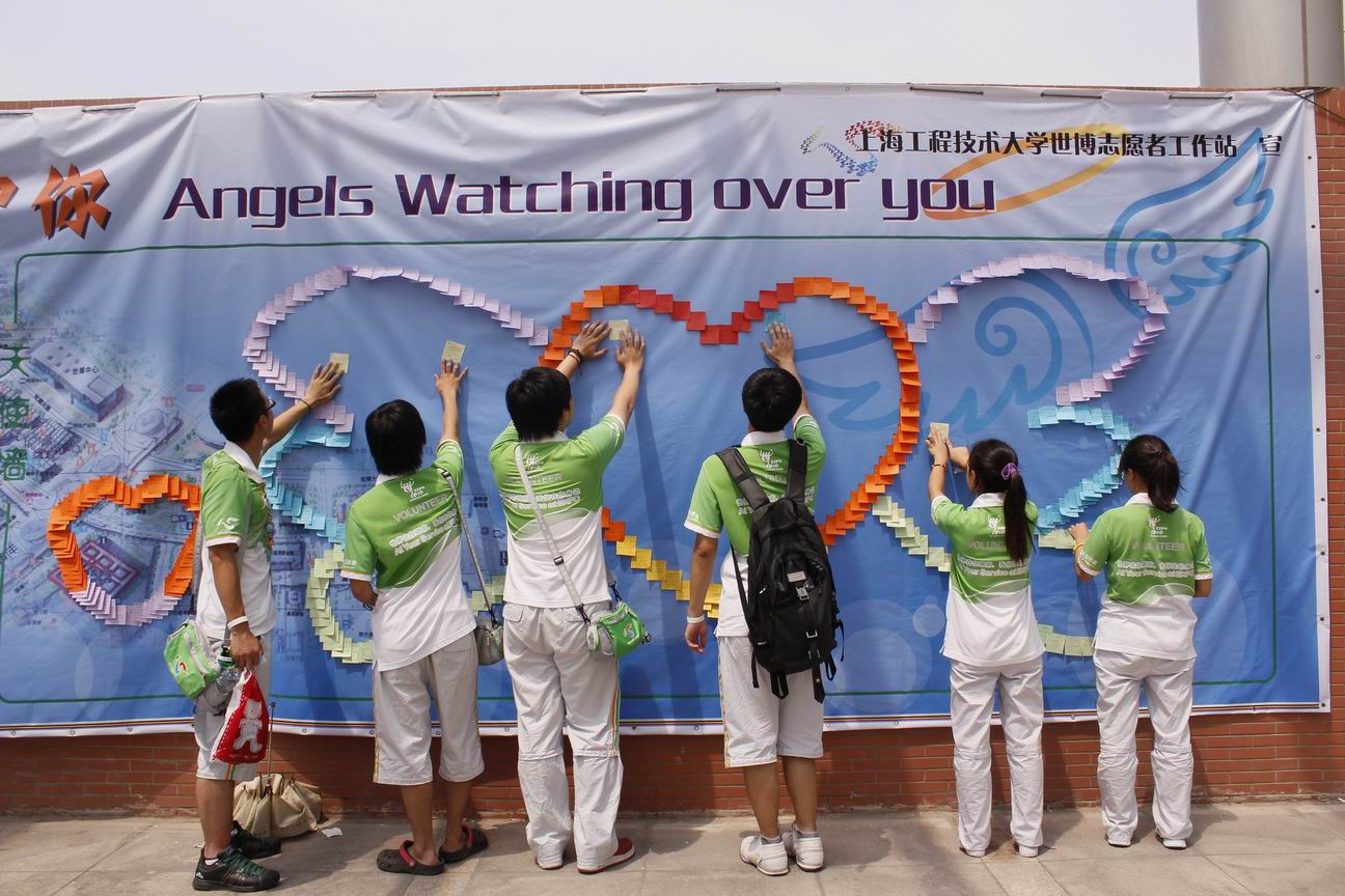 经过了多方准备,以及对志愿者祝福话语的收集, 守护天使活动是AB片区激励计划的重要环节,通过对志愿者随机配对,结成一对一的守护天使,即在AB片区448名志愿者中随机抽取224对互不相识的志愿者,他们彼此为对方的守护天使,每日可在天使墙上进行留言,互相勉励、互相鼓劲。天使墙为志愿者们搭建互动交流、同心协力的良好平台,让所有志愿者感觉到有一位天使守护身旁。 我们可以看到天使墙上巨大的“爱心天使”图案是由志愿者们用不同颜色便签纸写下寄语,粘贴而成的。每一张纸都承载了一位志愿者作为“天使”为他所守护的人带去的祝福,也承载着3044永利集团世博志愿者们团结一心、共同奋斗在世博志愿服务第一线的力量。