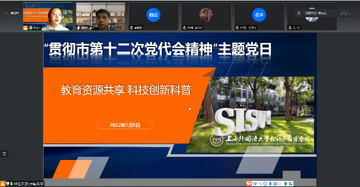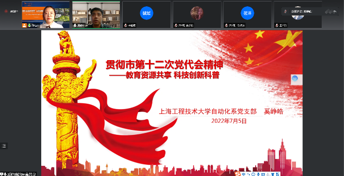为贯彻落实上海市第十二次党代会精神,2022年7月5日,通过腾讯会议线上平台自动化系党支部与上外松外举行了一次支部联建主题党日活动,此次活动的主题是“教育资源共享,科技创新科普”。自动化系党支部书记奚峥皓、自动化系主任王宇嘉、自动化系党支部党员王娆芬、徐冬梅、李毓媛、上外松外党总支书记王吉群、教导主任孙佳宏以及六年级的同学出席了此次活动。