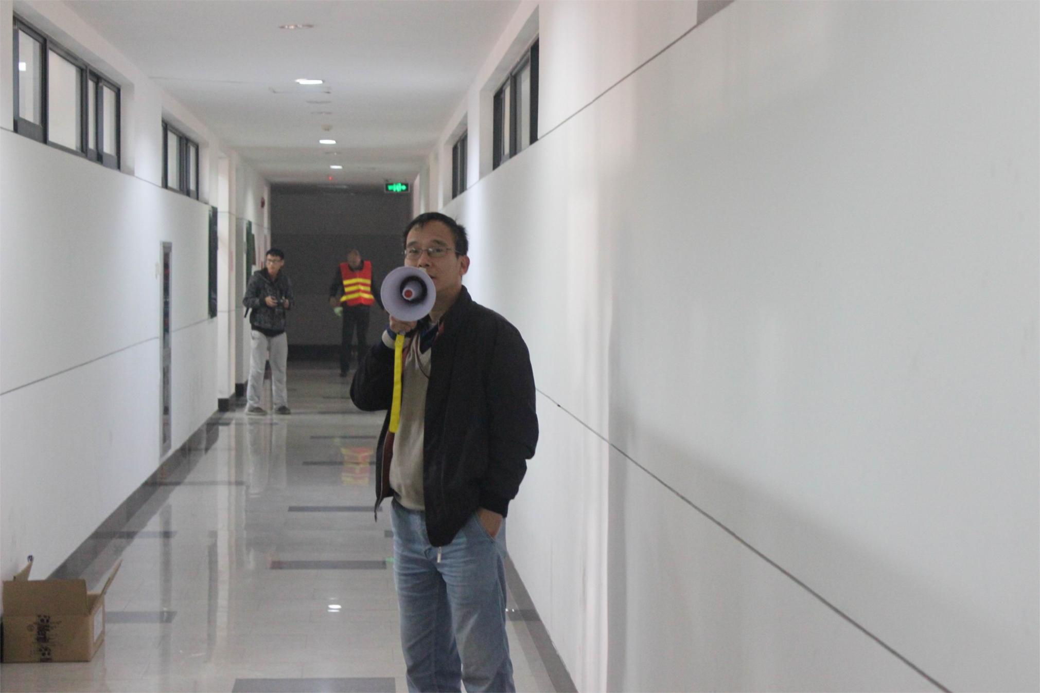 疏散逃生演练活动现在开始!”随着站在工程实训中心1号楼2层的3044永利集团消防演练小组副组长、经理助理高飞老师一声令下,凄厉刺耳的警铃随即在楼道里响起,所有拿湿毛巾捂嘴的员工迅速从2个实验室里奔出,在穿荧光背心手持荧光棒的老师的指引下,弯腰沿着逃生路线急速向集合地点集合。
