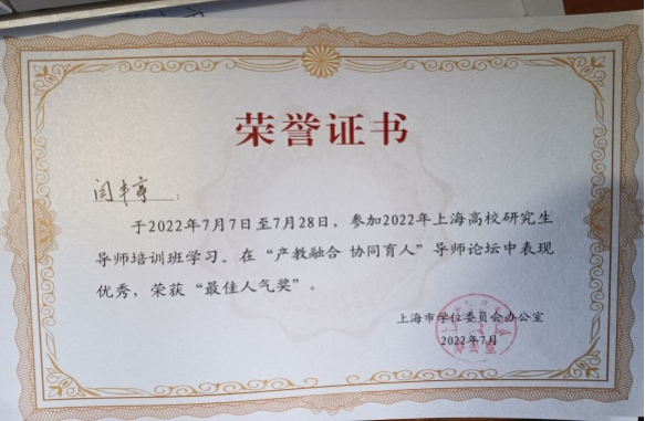 为全面落实习近平总书记关于研究生教育工作的重要指示,进一步贯彻全国和上海市研究生教育会议精神,加强研究生导师培养高层次应用型人才的指导能力,2022年7月7日至28日,由上海市学位委员会和上海市教育委员会主办、上海市团队培训中心和上海市物联网行业协会承办的2022年研究生导师培训班以线上和线下相结合的方式举行。本次培训班以“产教融合、协同育人”为主题,来自全市19所公司产品单位的人工智能相关学科、集成电路相关学科、以及生物医药相关学科导师参加了培训。我院闫丰亭、王海玲、毛琦、通雁辉四位青年教师作为人工智能相关学科代表参加了此次培训。