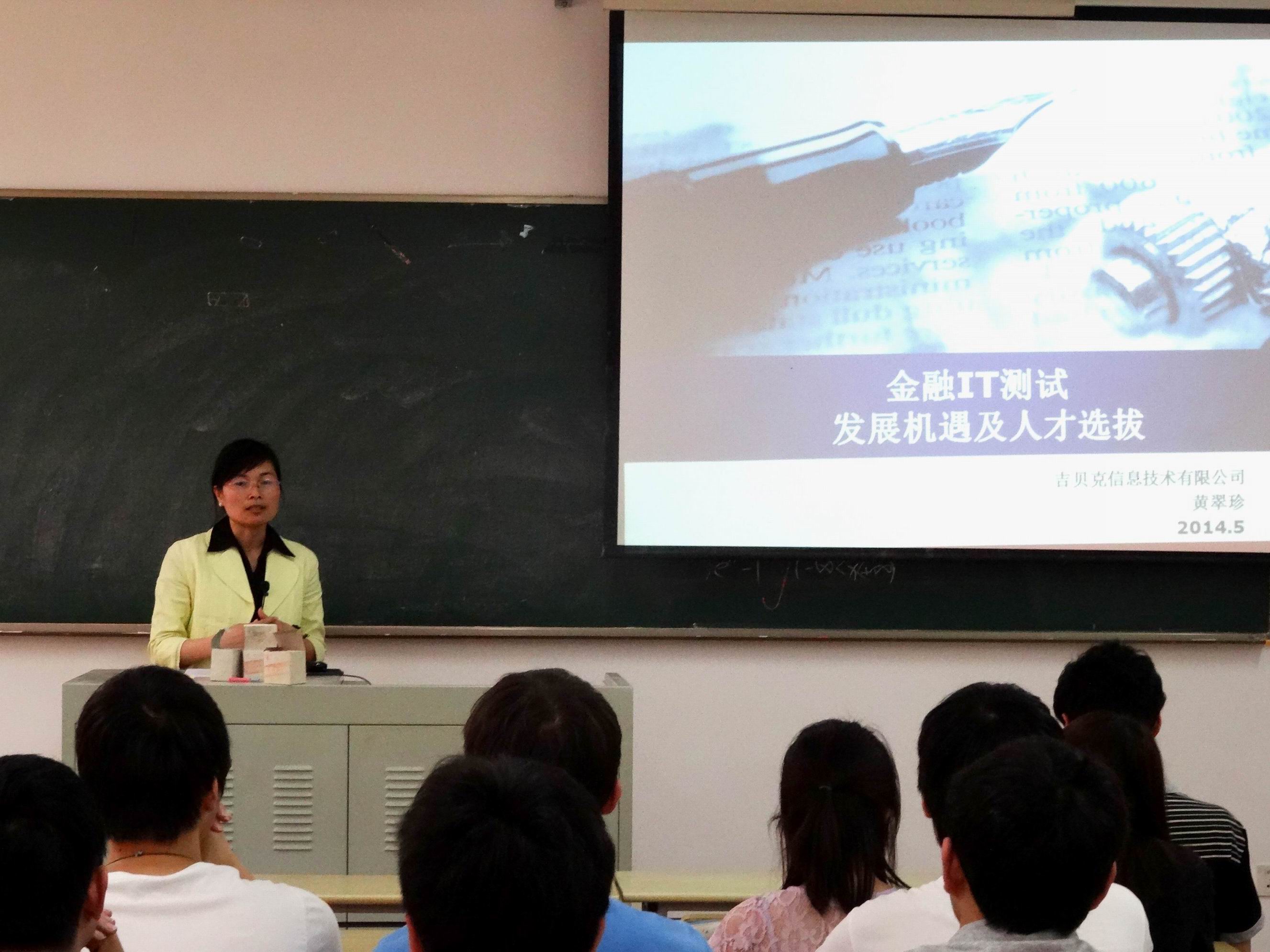 5月30日,上海吉贝克信息技术有限公司测试部总监黄翠珍女士受邀在教学楼D219开展了一次关于金融IT软件测试方面的专题讲座——《金融IT测试发展机遇及人才选拔》。电子电气工程公司相关教师和员工聆听了此次讲座。