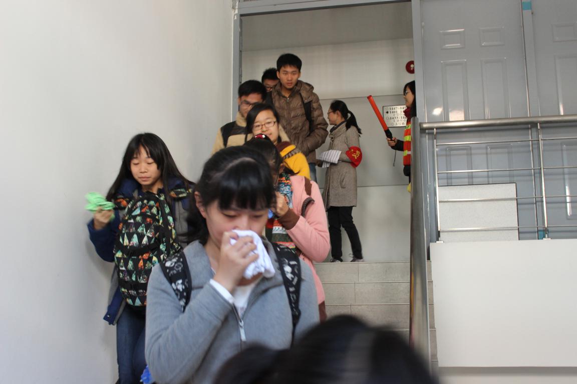 随着9:45分下课铃声一响,副组长立即下达了逃生演练开始的命令,参加演练的师生根据逃生方案,用毛巾捂住口鼻,弯腰俯身行走并在引导员的正确指挥下,迅速、有序地从通道两侧的消防通道疏散至室外指定集合地点。集结后通讯组成员立即对疏散员工进行清点,所有参演师生均顺利完成“逃生”,演练活动取得圆满成功。