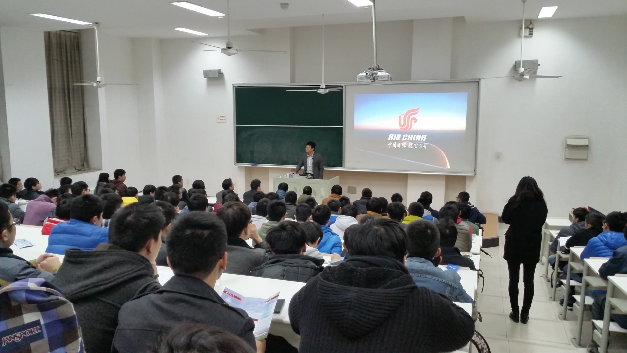 宣讲会开始,企业经理进行了宣讲,对中国国际航空公司企业背景、发展模式、工作环境和招聘计划做了详细介绍,国航具有很强的国内国际联程运输能力和销售网络,拥有广泛的高品质客户群体,已经成为众多中国政府机构及公司商务客户首选的航空公司。2011年6月28日,国航获得国际权威服务评级机构Skytrax的四星级认证,并于2012年6月12日荣获国际航协第68届年会暨全球航空运输峰会自助服务“便捷旅行”项目金奖。