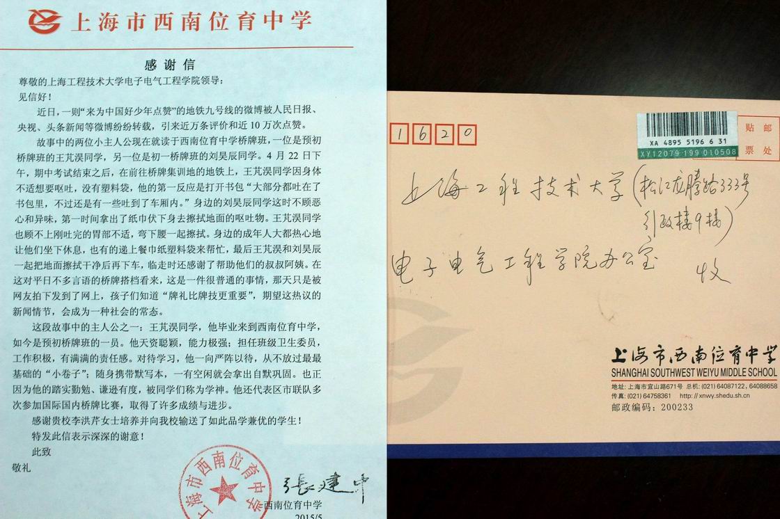 5月12日,3044永利集团收到上海西南位育中学寄来的一封感谢信,信中对公司李洪芹老师育子有方、为公司培养了优秀的小孩表示了深深的谢意。