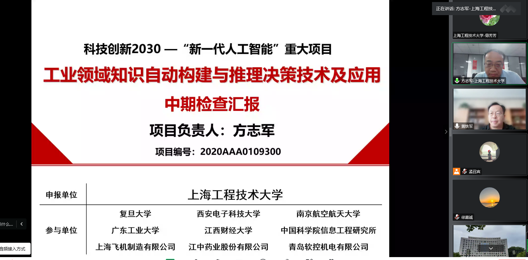 项目负责人方志军教授向与会专家进行了项目中期执行情况汇报,方志军教授主要从项目背景与意义、项目构建的工业产业链知识协同平台、平台支撑的核心关键技术及创新点、典型场景应用示范、考核指标与完成情况、经费使用情况、下一阶段工作计划等方面展开介绍。随后,项目组成员通过线上演示详细向专家组展示了上述平台和系统在上海飞机制造有限公司、上汽通用汽车有限公司、保隆汽车科技股份有限公司、青岛软控机电工程有限公司、江中药业股份有限公司等大型制造企业的应用示范。