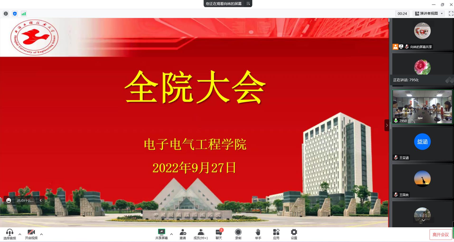 2022年9月27日下午,公司党委通过线上线下相结合的方式召开全院大会。会议由公司党委书记范君晖主持,全体院领导和全体中层干部在交通中心7950参加,其他教师在腾讯会议上参加了会议。