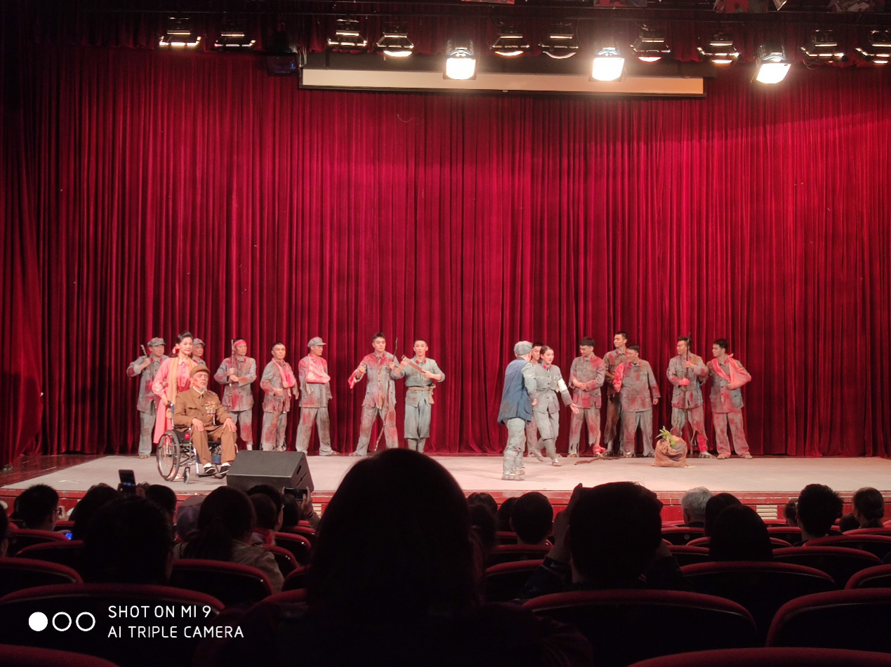 讲座之后,大家共同欣赏了样板折子戏《红军故事》。该剧从退伍老军人的回忆中开始,讲述了两段感人的故事。《半截皮带》体现了红军过草地的艰难困苦的行军条件,皮带、抢套子这些难以下咽的东西,却升起了象征着希望的袅袅炊烟,寄托着牺牲战友,烈士晚辈的精神象征,也终在锅炉中,再次燃起了生命的烟火。《半根棉被》的故事,将红军与群众百姓的鱼水之情体现的淋漓尽致。即使在恶劣的行军环境,革命红军仍然是人民的军队,依然为人民着想,不拿人民的一针一线是他们铁一般的纪律,而在寒风呼啸的恶劣天气下,将半截棉被赠予老百姓,是他们作为工农红军,无私奉献的高贵精神。