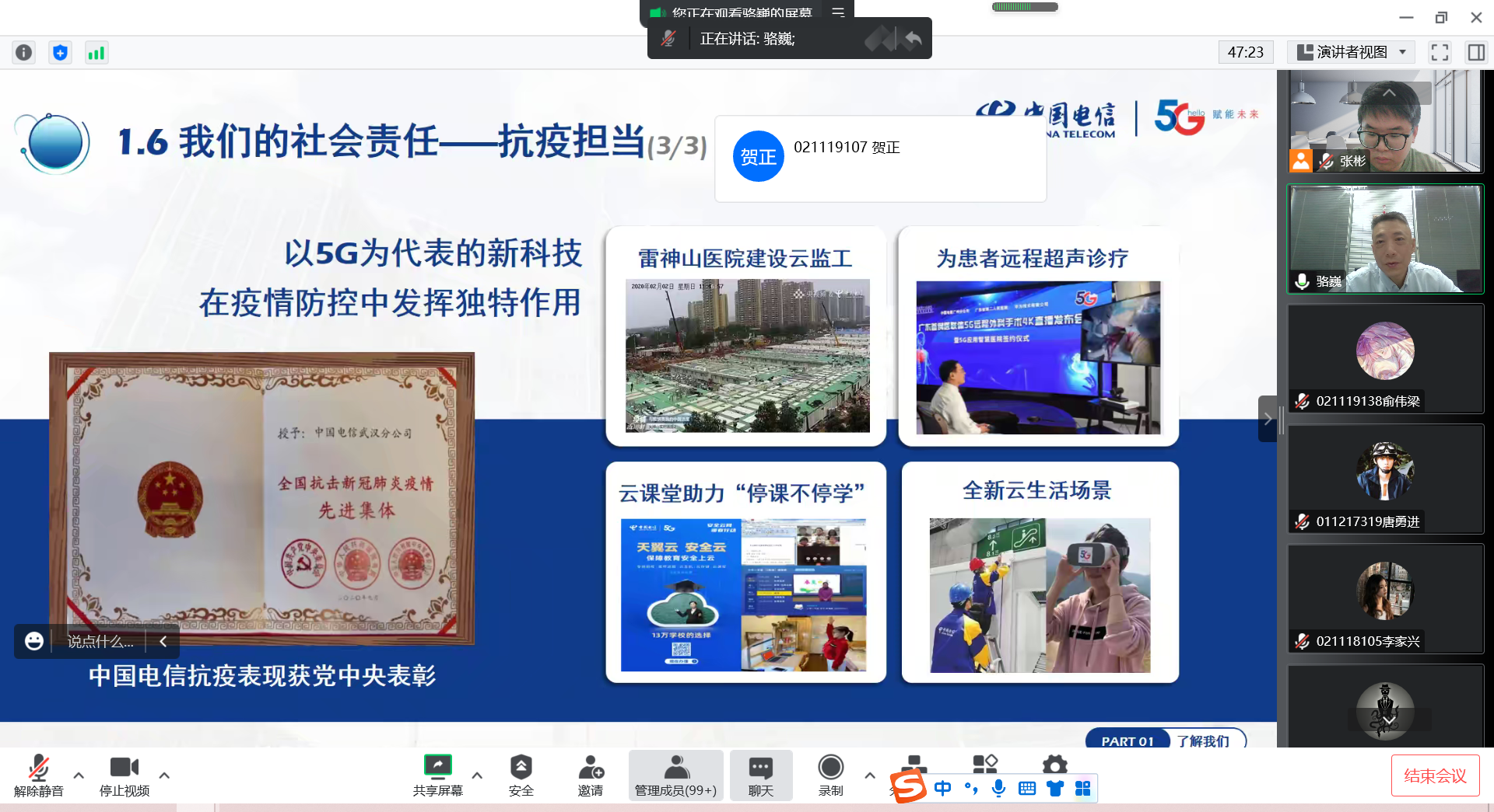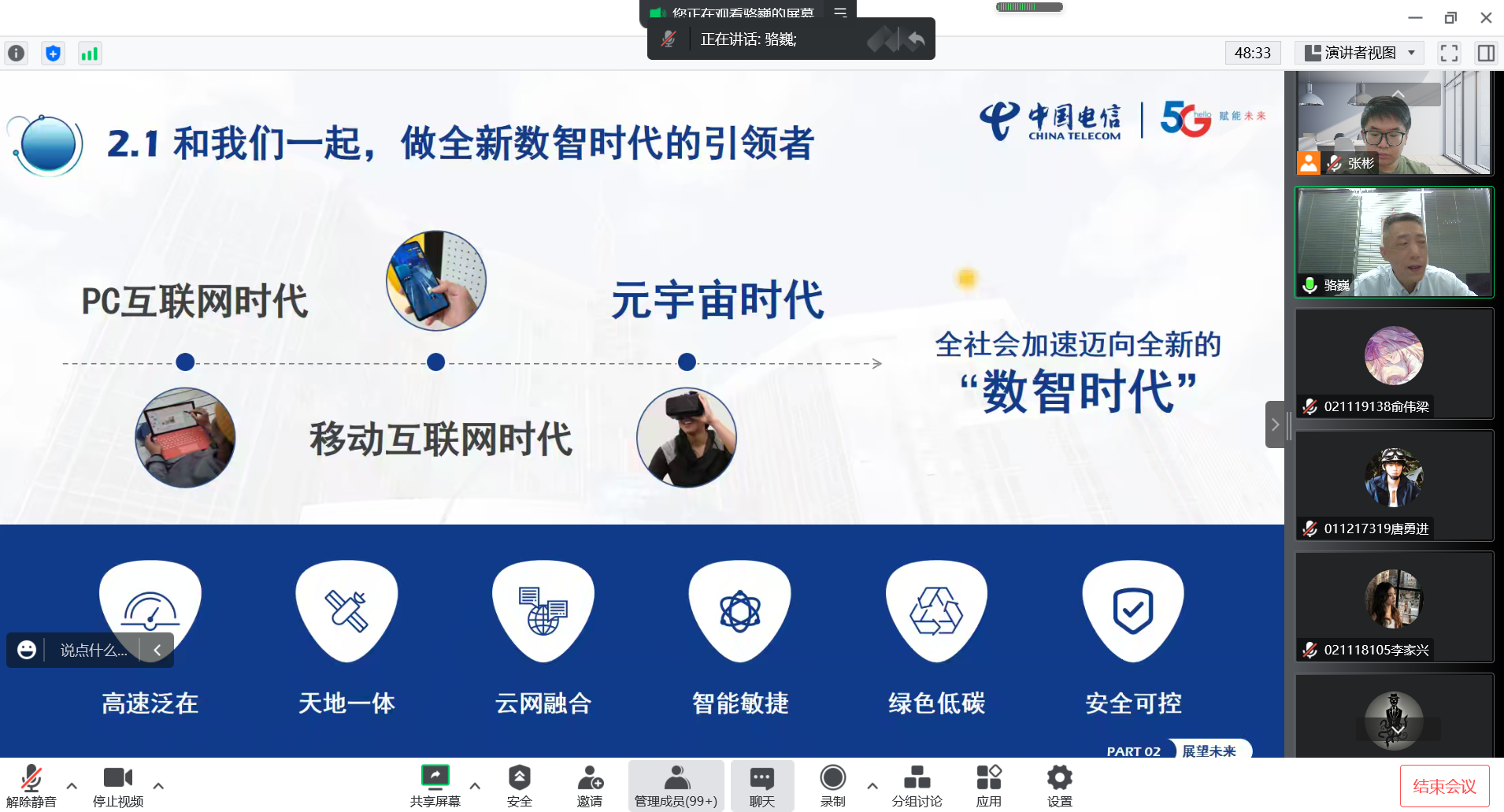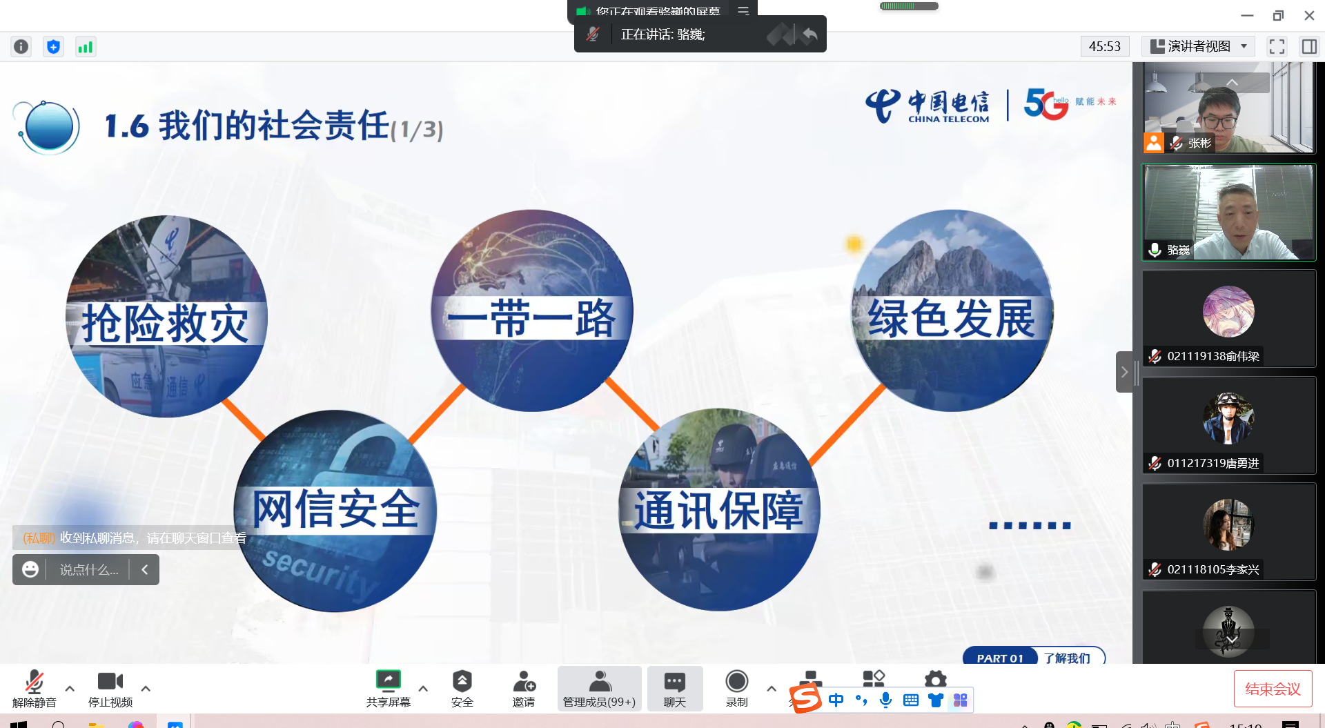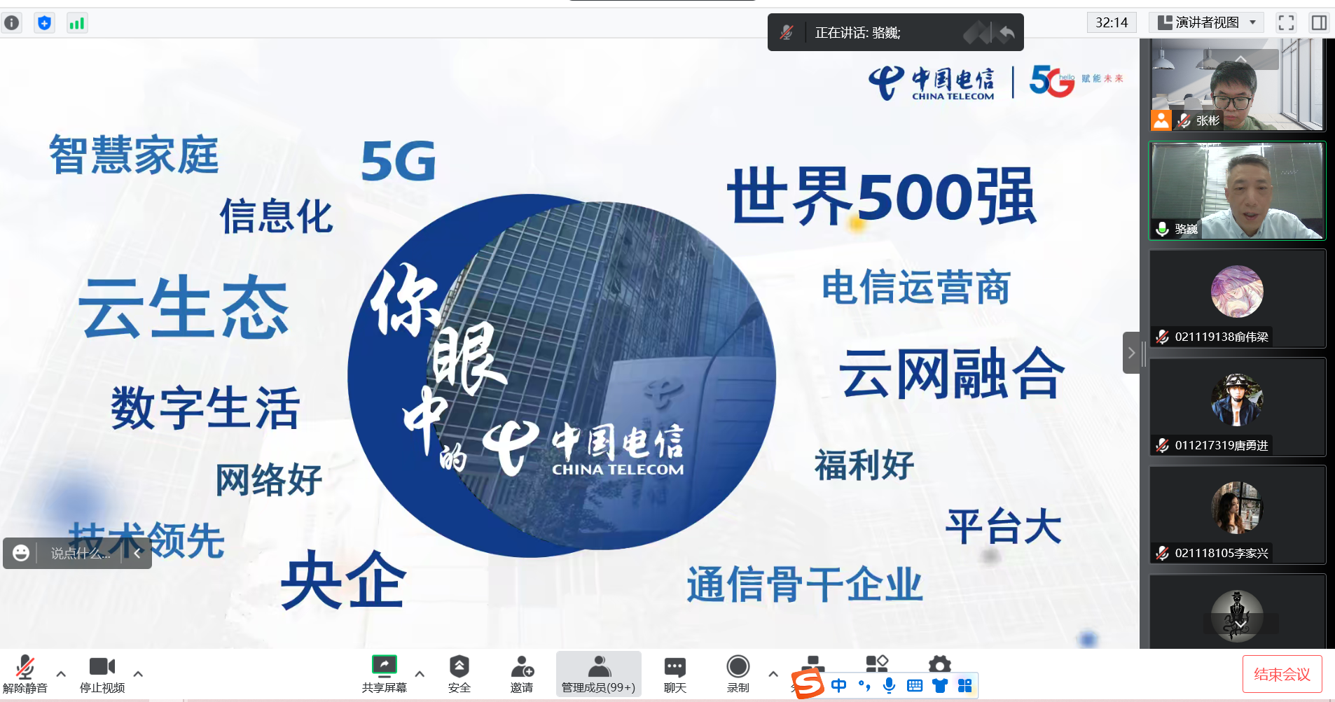 随后,骆主任对电信进行了详细介绍。中国电信业务覆盖范围大,遍及全球,拥有较大规模的云计算、宽带等,随着“互联网+”消费繁荣和智能5G的迅速发展,中国电信在抢险救灾、一带一路、绿色发展、网信安全、通讯保障发挥重要担当。特别是是疫情防控中发挥了重大作用,中国电信被授予全国抗击新冠肺炎疫情先进集体,涌现出一大批通信铁军。电信未来将走从互联网到移动互联网再到智能化服务的转型升级道路。作为大企业、大品牌,电信拥有大平台和好前程,能够让毕业生得到更好的发展机遇。
