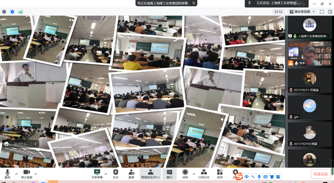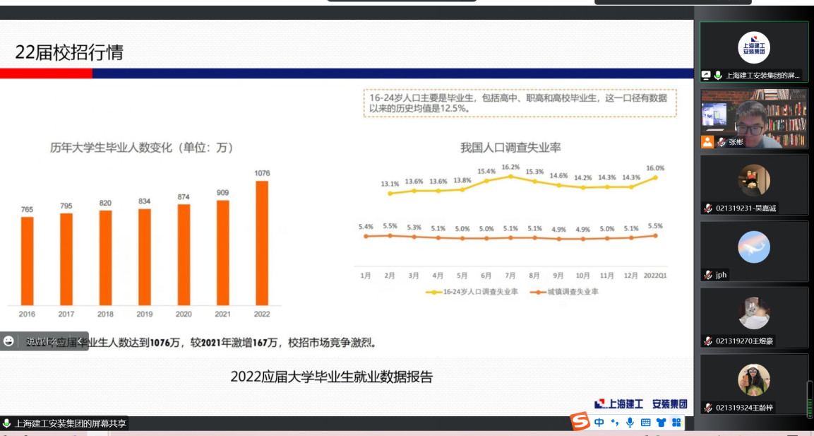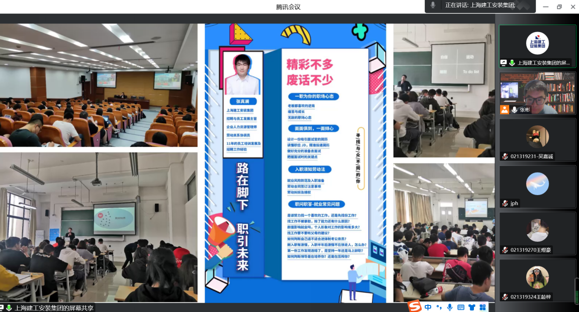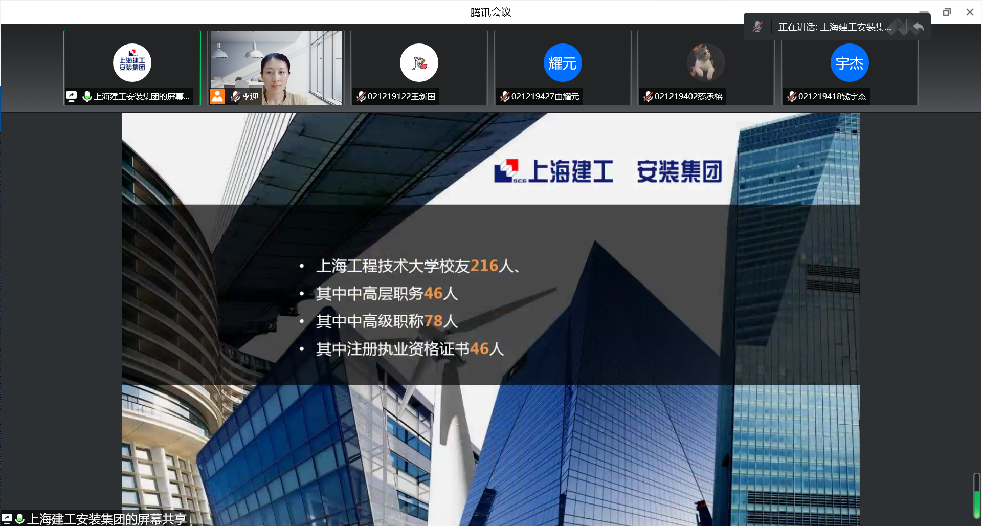 企业首先回顾了多年来在公司的招聘情况,员工发展情况。向各位同学介绍了企业的历史发展情况,以“初心落行动,使命担在肩”为主题,阐述了企业在民族复兴征程中所担当的责任。在新冠疫情防控、方舱建设中上海建工安装集团勇于承担社会责任,主动担当,发扬建工劳模精神,争分夺秒为疫情防控贡献力量,建工人成为值得骄傲的职业。