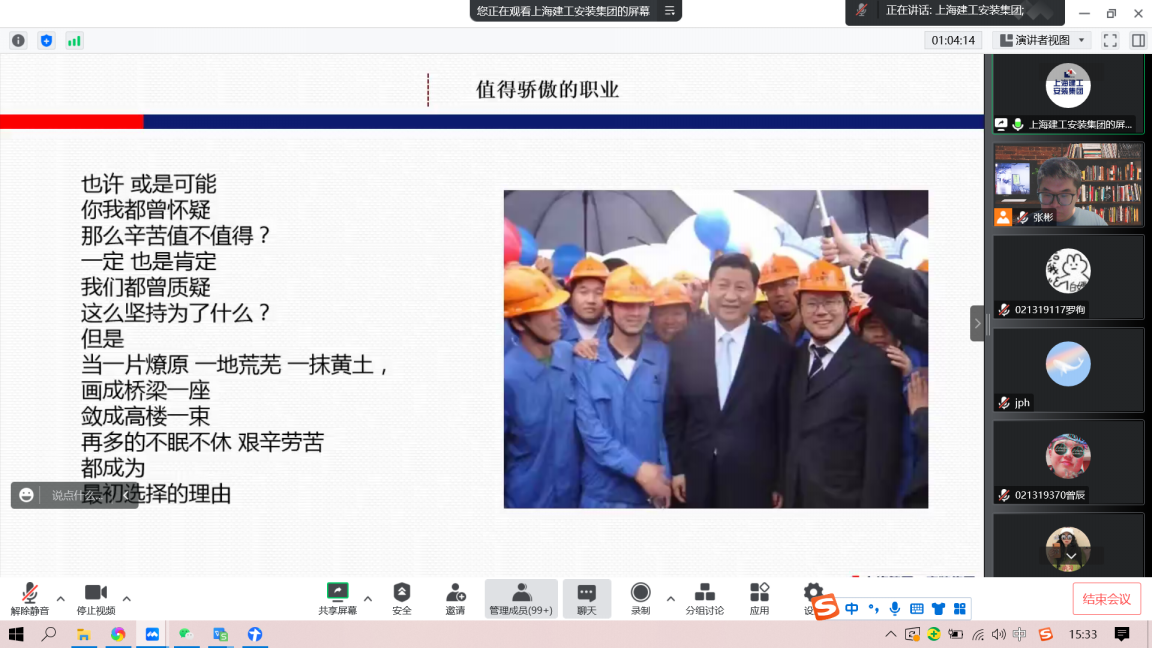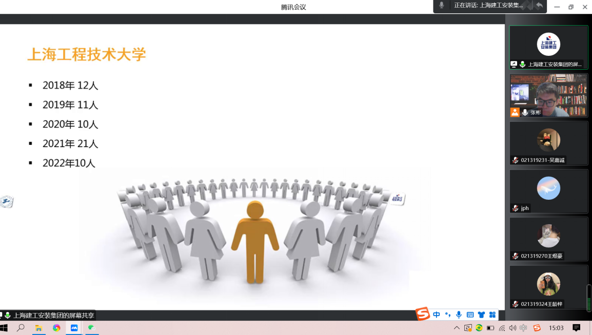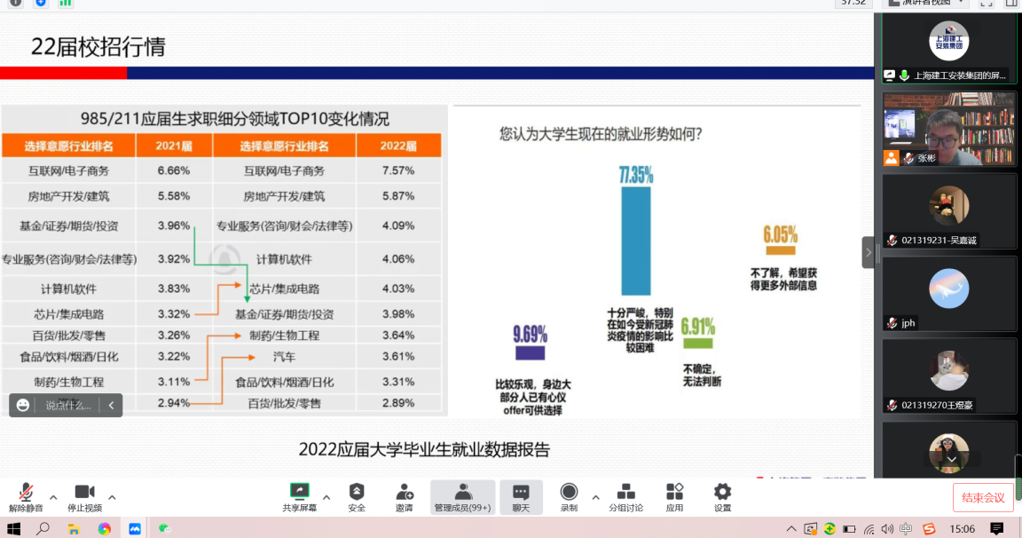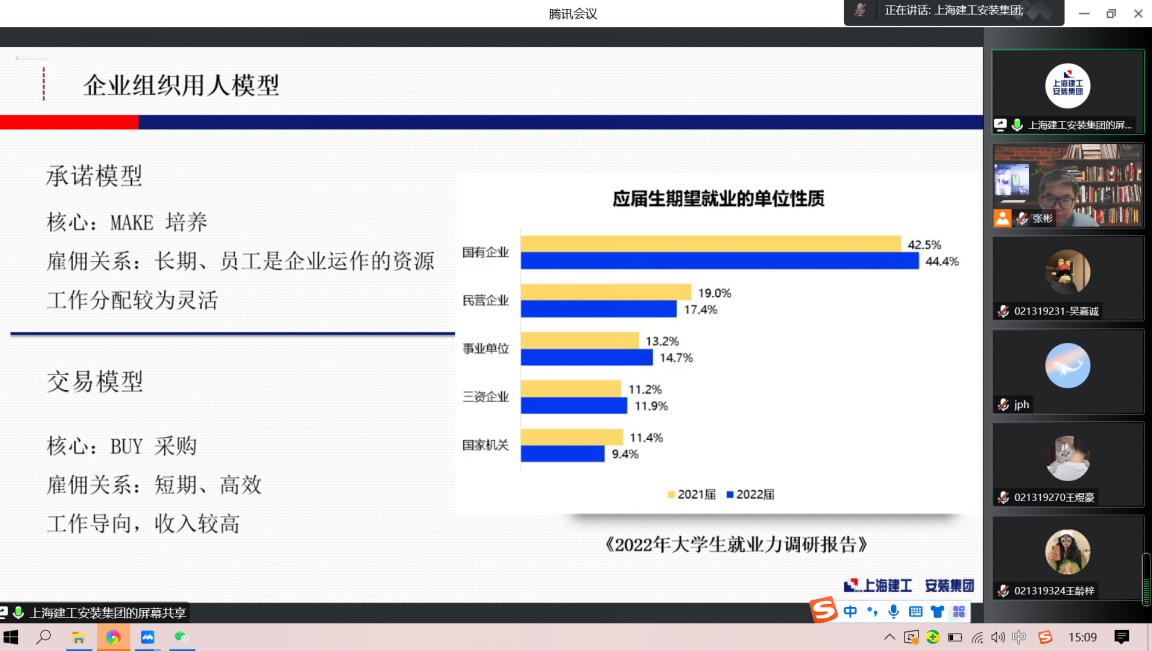 企业首先回顾了多年来在公司的招聘情况,员工发展情况。向各位同学介绍了企业的历史发展情况,以“初心落行动,使命担在肩”为主题,阐述了企业在民族复兴征程中所担当的责任。在新冠疫情防控、方舱建设中上海建工安装集团勇于承担社会责任,主动担当,发扬建工劳模精神,争分夺秒为疫情防控贡献力量,建工人成为值得骄傲的职业。