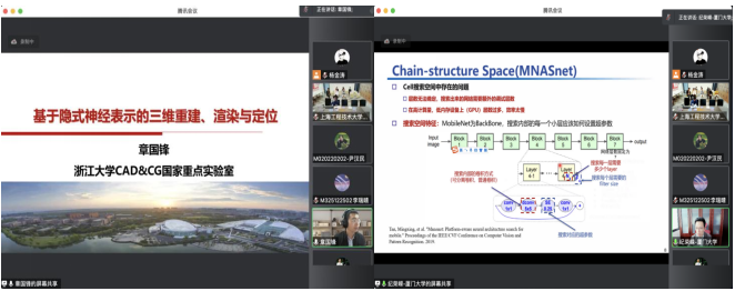 论坛中上海海事大学信息工程学经理周日贵教授以“量子图像处理技术”为主题作主旨报告,阐明了量子图像处理技术的研究背景及研究现状,并详细介绍了周日贵教授团队在量子图像处理算法中的工作及其仿真验证;厦门大学科技处处长,国家杰青纪荣嵘教授以“神经网络结构搜索”为主题作主旨报告,通过网络结构变迁的背景和当前研究领域面临的一些问题着手,提出解决方案和探索策略,搜索策略;浙江大学CAD&CG国家重点实验室教授,国家优青章国锋教授作题为“基于隐式神经表示的三维重建、渲染与定位”的主旨报告,报告介绍了神经隐式的背景、应用场景及其未来的挑战与现实中的应用。硕士研究生陈少涛、茹亚军就自己研究方向所获得的最新成果做交流分享。从选题背景、研究意义、国内外研究现状几方面入手,详细分析当前面临的问题和解决思路,并作未来展望。