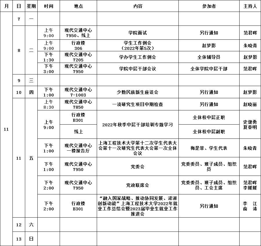 公司第10周活动安排(2022年11月7日-2022年11月13日)
