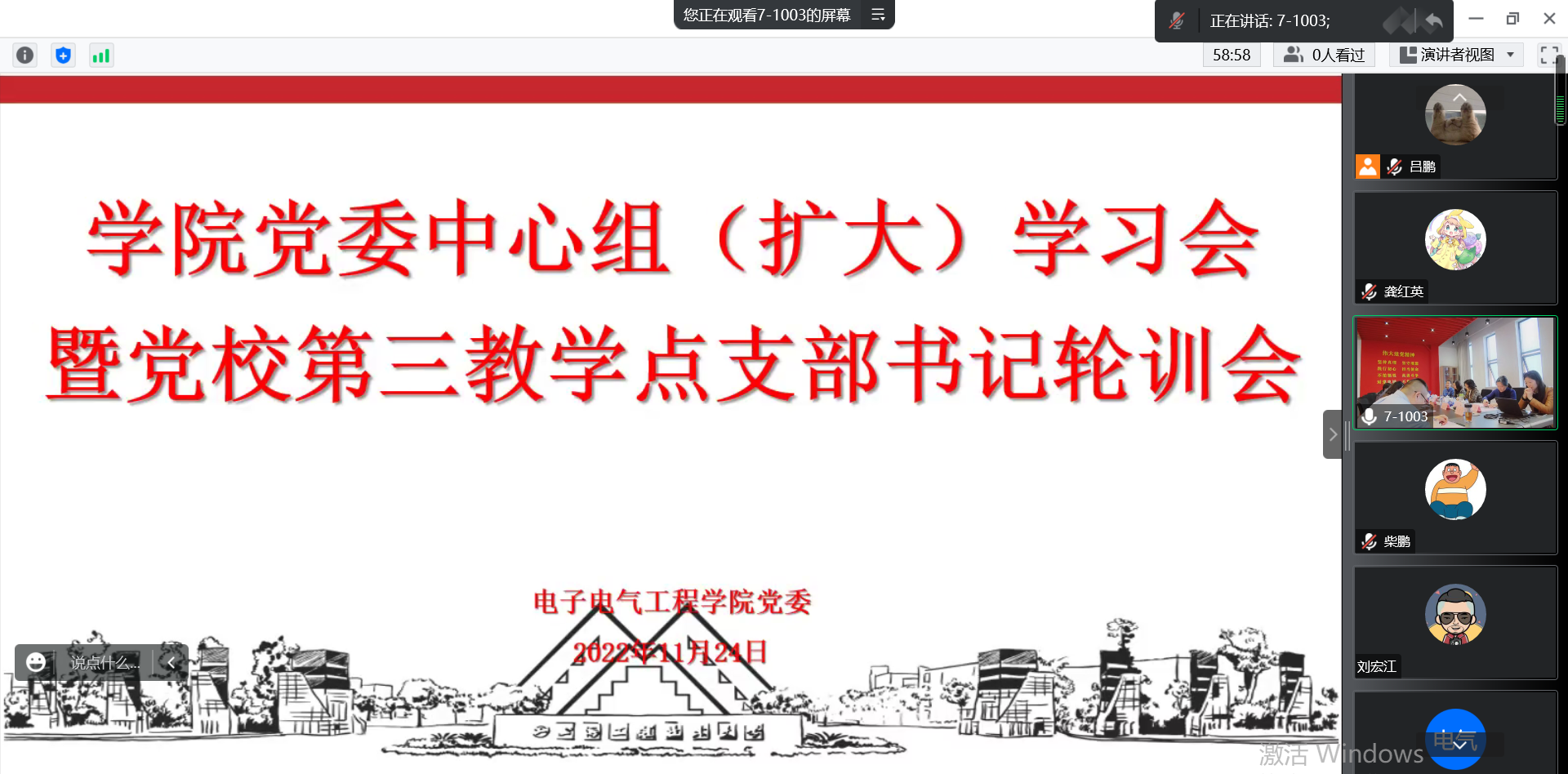 11月24日上午,公司党委通过线上线下相结合方式召开中心组(扩大)暨党校第三教学点2022年党支部书记轮训班专题学习会,特邀校学习贯彻党的二十大精神宣讲团成员、马克思主义公司徐静副教授做《扎实推进专业建设,积极投身科技强国——深入学习宣传贯彻党的二十大精神》专题报告,巡察办主任刘珺、公司党委委员、党政班子、党校第三教学点党支部书记、副书记、委员等参加学习,会议由公司党委书记范君晖主持。
