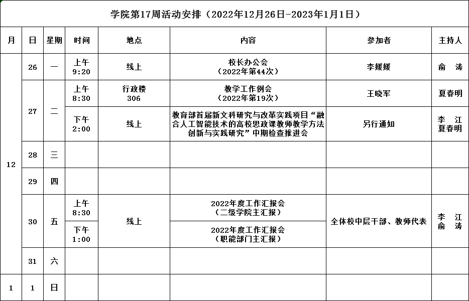 公司第17周活动安排(2022年12月26日-2023年1月1日)