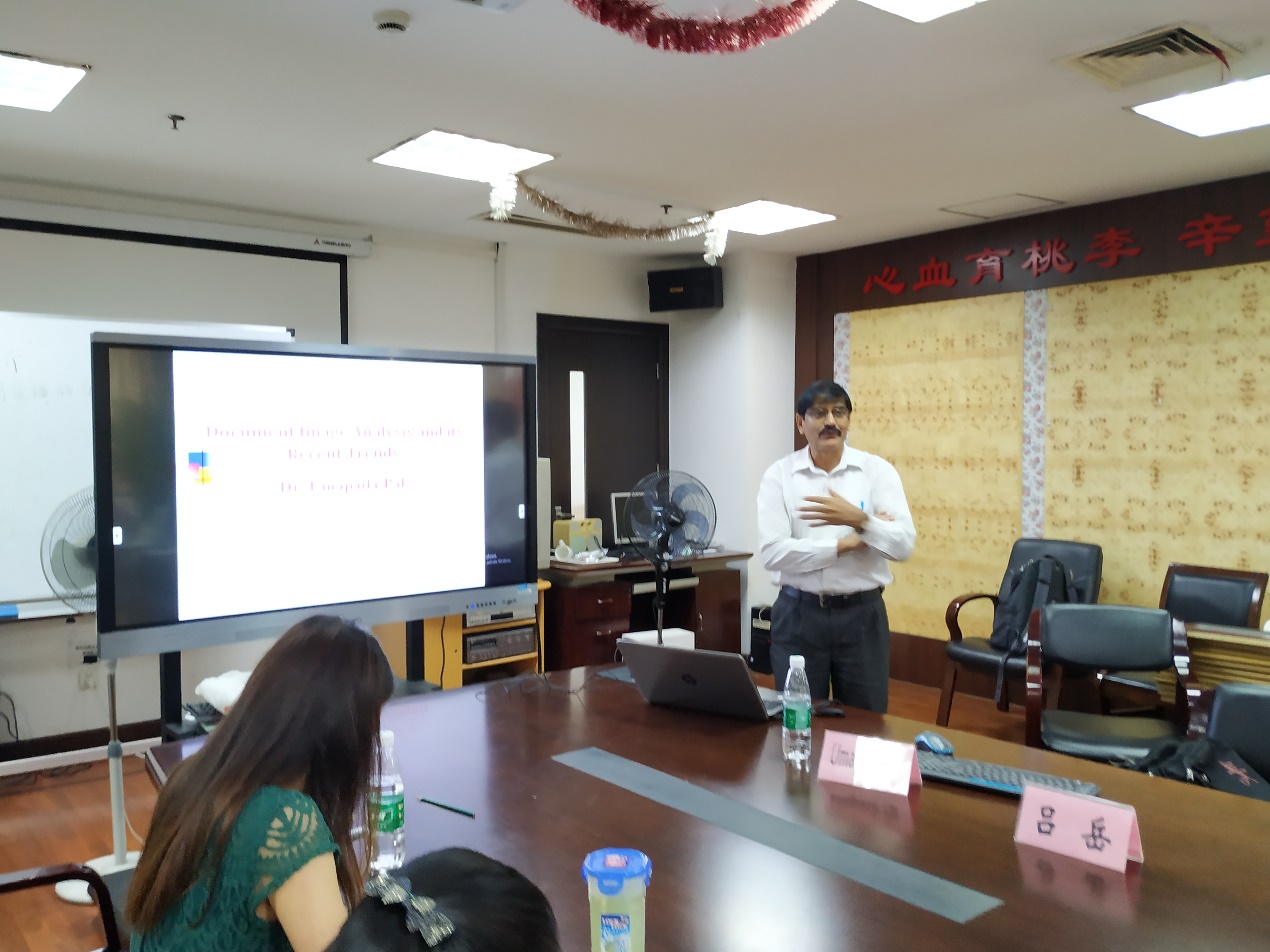 Umapada Pal教授先后介绍了印度统计研究所的基本情况,及自身主要研究领域,重点讲解了“Air writing”、“Mobile OCR”、“Brain computing by EEG”、“Document retrieval”、“Document fraud detection”等几项应用的关键技术,他针对每个应用都做了现场演示,并与在座师生进行互动。