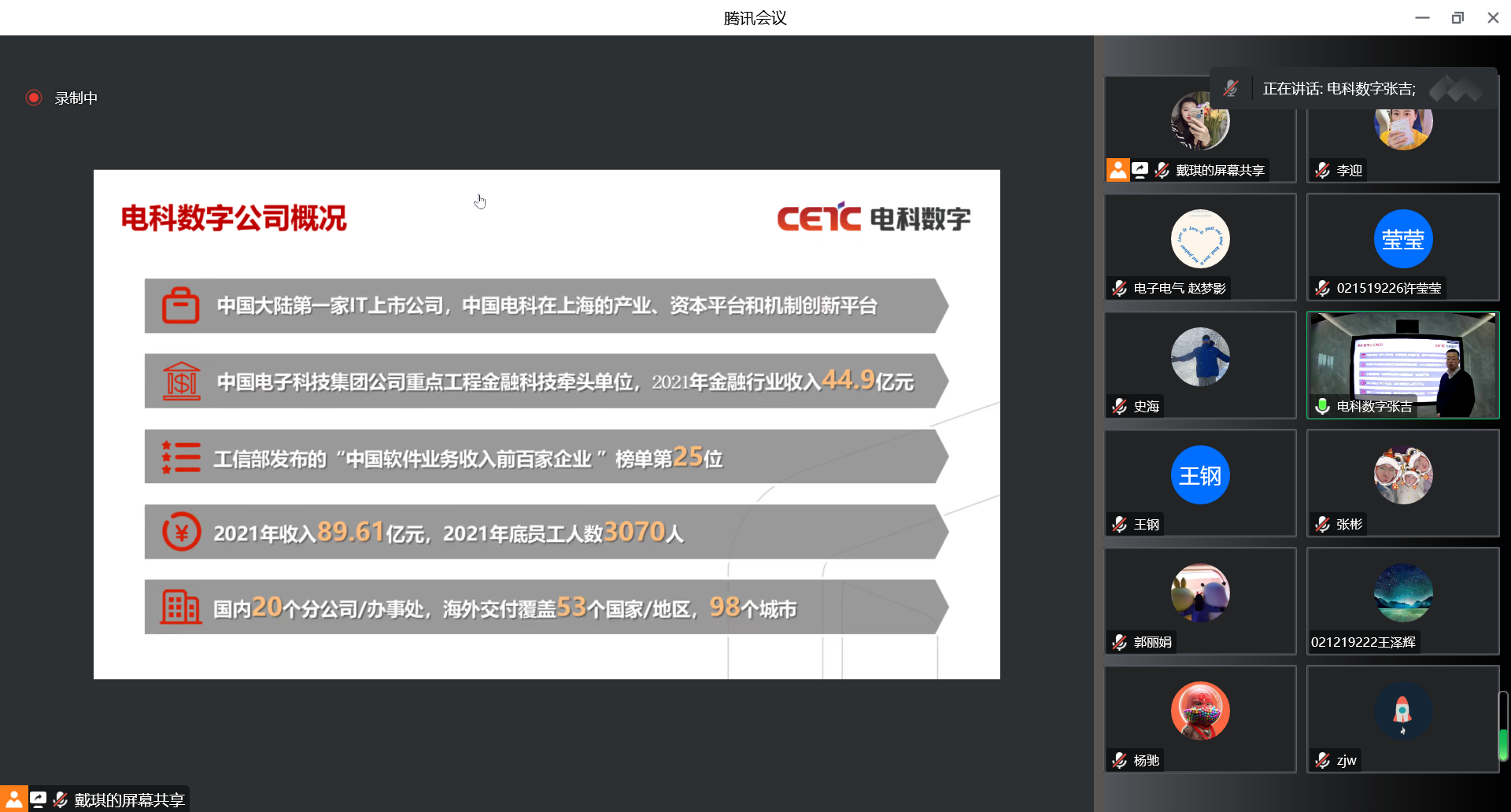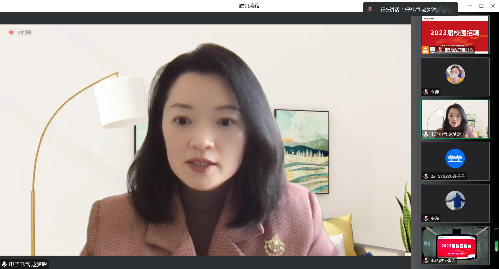 中电科数字技术股份有限公司的技术专家王刚和招聘人事张吉分别介绍了公司情况和职业晋升通道,并对2023届毕业生进行了线上招聘宣讲。