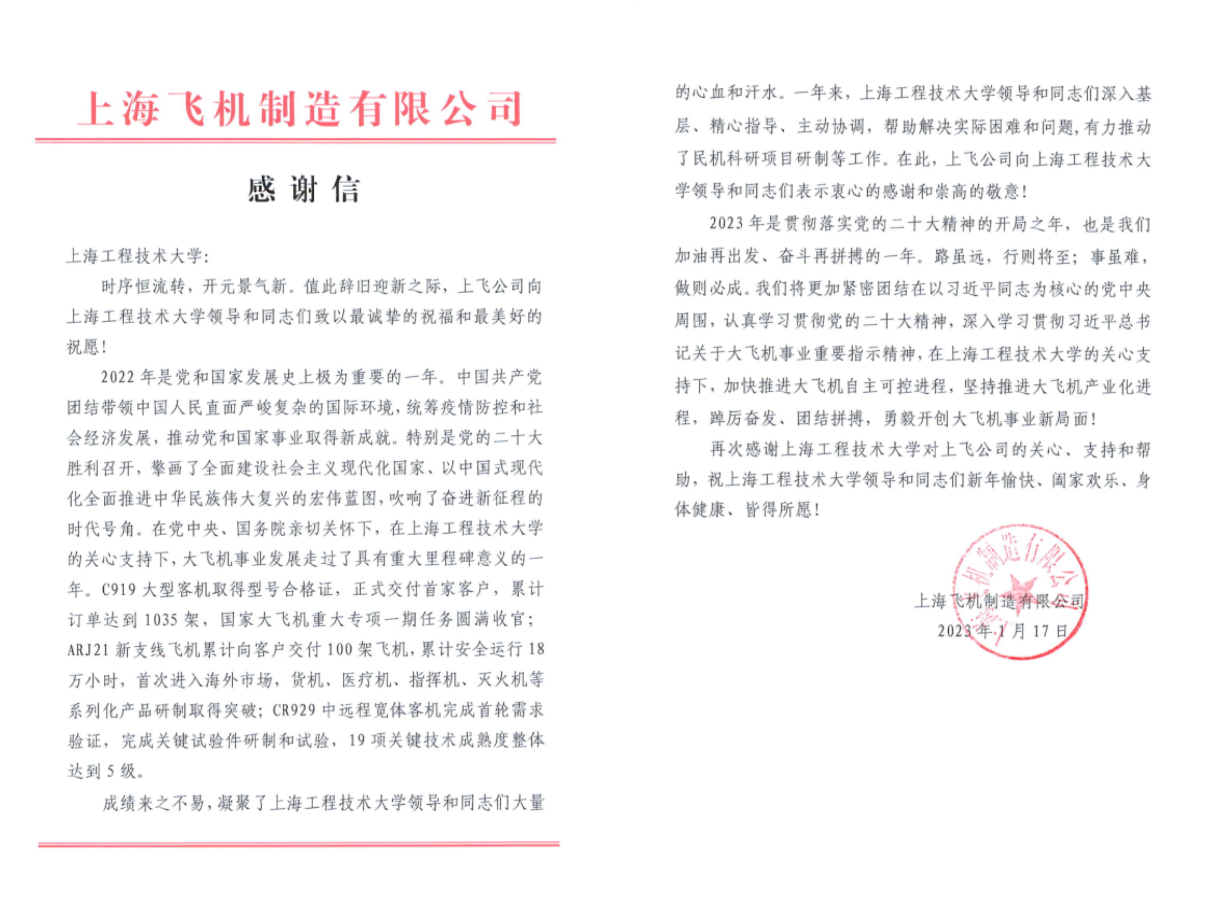 福兔迎春崭新篇,瑞鹤呈祥喜气来。值此辞旧迎新之际,公司收到来自商飞上海飞机制造有限公司的感谢信,信中表示,2022年是党和国家发展史上极为重要的一年,特别是党的二十大胜利召开,擎画了全面建设社会主义现代化国家、以中国式现代化全面推进中华民族伟大复兴的宏伟蓝图,吹响了奋进新征程的时代号角。感谢信充分肯定了3044永利集团领导和同志们深入基层、精心指导、主动协调、解决难题,有力推动了民机科研项目研制等工作,助力大飞机事业发展。在过去的一年,商飞取得了C919大型客机型号合格证,正式交付首家客户等具有重大里程碑意义的成绩,成绩来之不易,也凝聚了公司领导和同志们大量的心血和汗水。