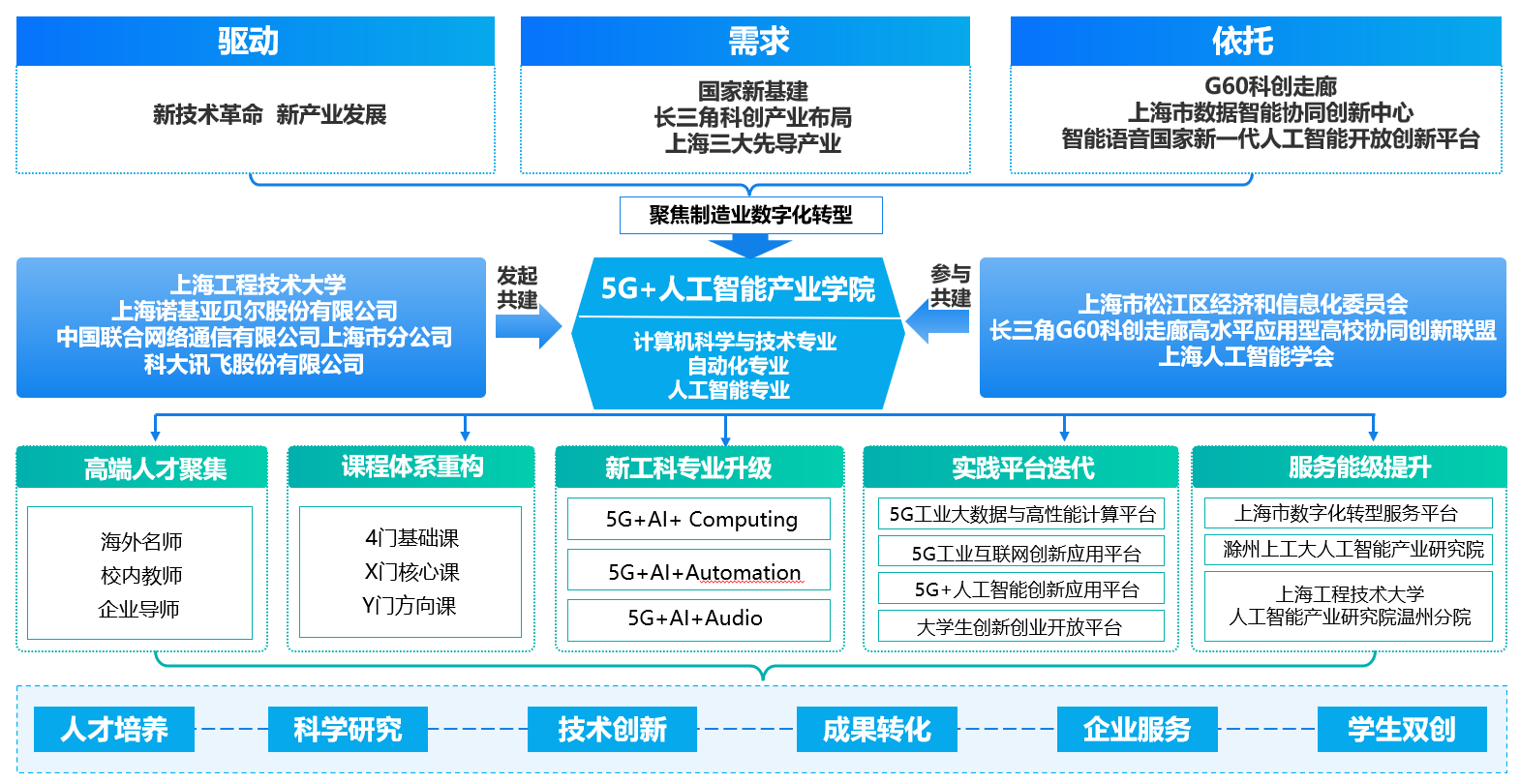 作为教育部“卓越工程师教育培养计划”首批试点高校、全国地方高校新工科建设牵头单位、上海市“高水平地方应用型高校”试点建设单位,公司5G+人工智能产业公司面向国家新基建、长三角一体化战略布局和上海三大先导产业需求,依托G60科创走廊、上海市数据智能协同创新中心、国家新一代人工智能开放创新平台,聚焦制造业数字化转型,形成“海外名师+校内教师+企业导师”协同育人主体、“国际科技前沿+关键工程技术+产业发展动态”协同育人路径、“课外巩固+校外延伸+境外拓展”协同育人平台,打造多元协同的人才培养模式;与上海诺基亚贝尔、中国联通、科大讯飞等知名企业深入合作,培养能够解决复杂工程问题、具备创新意识,产业迫切需要的具有5G、人工智能、智能控制等技术交叉融合、深度共享的高素质应用型人才,推动制造企业数字化转型,促进地方经济高速发展。