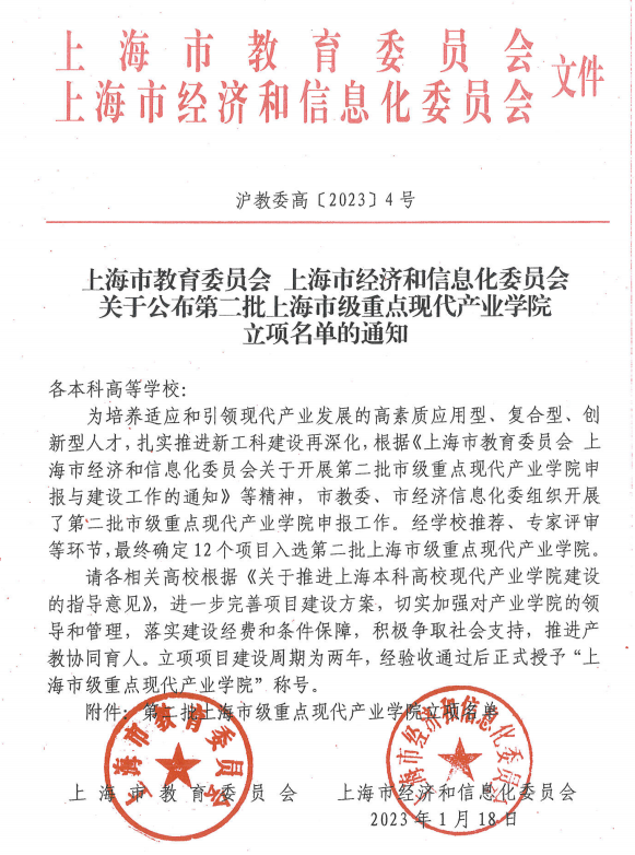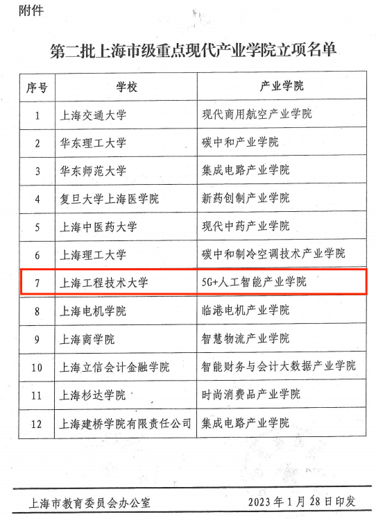 近日,上海市教育委员会、上海市经济和信息化委员会正式印发《关于公布第二批上海市级重点现代产业公司立项名单的通知》(沪教委高〔2023〕4号),公司3044永利集团申报的5G+人工智能产业公司成功获批。