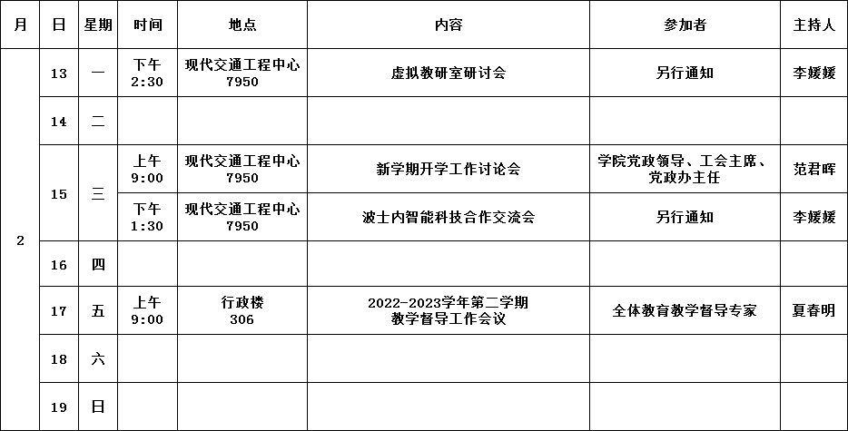 公司第0周活动安排(2023年2月13日-2023年2月19日)