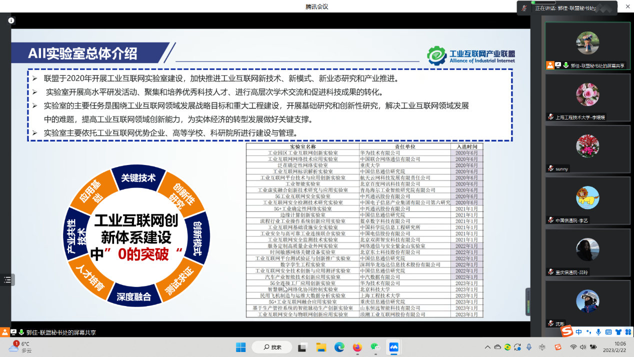工业互联网产业联盟于2020年开展工业互联网实验室建设,旨在加快推进工业互联网新技术、新模式、新业态研究与产业推进。公司民用飞机制造与运维大数据分析实验室于2023年1月加入该联盟。在此次会议中,联盟沈彬处长为成员介绍本年度实验室总体工作安排,为4月份召开的工业互联网创新成果发布会征集成果并邀请专家评审,安排了不同批次实验室本年度的考核工作安排。在创新成果申请表的意见征集过程中,李经理就创新性证明的类型与范围提出了相应建议,得到了联盟认可。