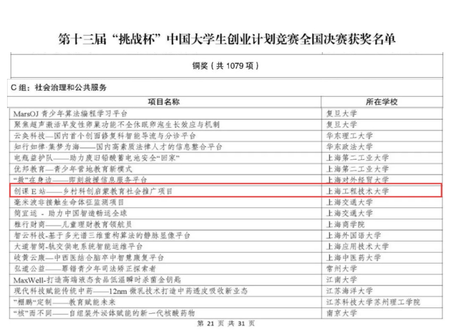 公司张豈明同学领衔的“创课E站”项目团队,在校团委及公司领导的关心支持下,在公司团委和高艳杰、张彬、梅是菲等几位老师的用心指导下,在市赛中斩获金奖,在此次国赛中喜获铜奖,充分展示了公司学子“无挑战、不青春”的靓丽底色。