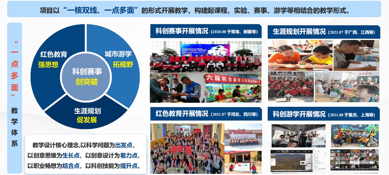 获奖项目《创课E站——乡村科创启蒙教育社会推广项目》,立足“教育振兴、科创兴才”的愿景,利用专业知识和公司学科特色,融合工程教育、智慧教育、创新教育的资源支撑,构建以科创教育现场教学服务为基础,辅以科创团队培养、教育信息化发展、创客教室建设、线上教学实践、特色课程定制等五大模块化配套服务的科创启蒙教育服务体系,勇做中国乡村科创启蒙教育的深耕者!项目先后开展科创教育1320余课时,覆盖9省15市180余个乡村6800余名青少年,累计建成8间乡村创客教室,收获了良好的社会效应,形成了稳定的特色发展路径,并受到各级领导的关心指导,被人民网、东方网等重要媒体报道30余次,获服务地感谢信20余件。