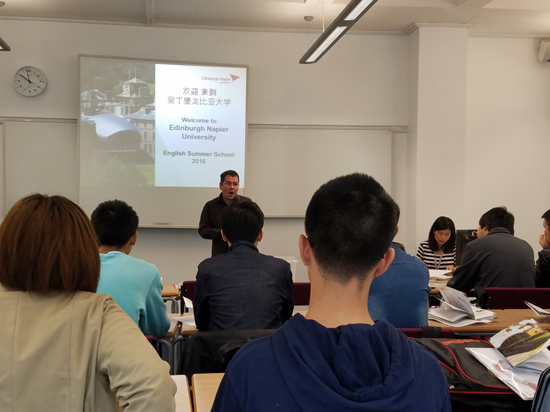 在开学典礼上,同学们受到了来自龙比亚大学的中国部主任姚翰斌、外教导师Trevor Lord、Michael Harkness以及负责员工日常管理工作的Aril Tsai等老师的热情欢迎,Trevor Lord首先为大家介绍了两周丰富精彩的学习安排,有英语口语、词汇的练习、有英国历史与当代文化的交流以及爱丁堡城堡、皇宫、苏格兰博物馆、图书馆等著名景点文化的领略等,风趣的Trevor老师还从文化、天气方面为大家讲解了苏格兰的特色,他说,苏格兰的天空就是一面美丽的幕墙,虽然天气变幻十分频繁,但它总是能为这个城市天上美丽的一笔。