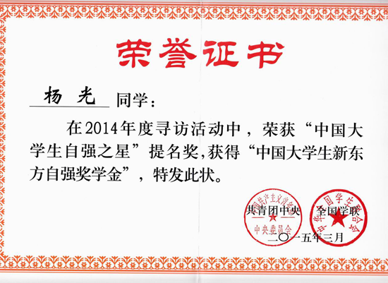 杨光同学获“中国老员工自强之星提名奖”