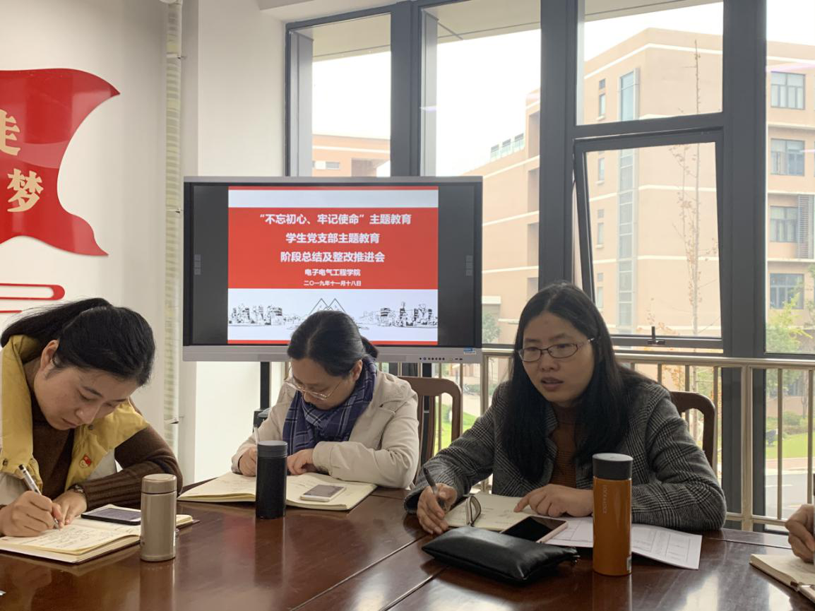 会上,员工党支部各支部书记分别进行了主题教育阶段性总结汇报,本次汇报中,各支部基本完成了上级部署的“十个一”主题教育规定动作,如组织员工党员参加第83届电工大会志愿者、41周年校庆志愿者,参观红色革命基地史量才故居,开展《习近平新时代中国特色社会主义思想学习纲要》微党课等活动。员工党支部书记为了进一步丰富主题教育内容,调动员工党员们的学习积极性,根据各支部员工党员组织结构和学习特点,开展了系列特色活动。如研究生第一党支部在《习近平新时代中国特色社会主义思想学习纲要》微党课中以“专题+主题”的形式,引导员工在《纲要》学习和讨论中与专业相结合;研究生第二党支部在学习制度和学习内容上齐头并进,形成了“学习强国天天晒,红色党课周周上”的学习模式;研究生第三党支部开展了“树典型”的学习先锋模范学习活动和“大手牵小手”考研助力活动;研究生第四党支部从“整改问题清单”入手,抓住重点及时整改,开展集中研讨活动,让每一次支部活动都充满“仪式感”;员工第一党支部开展“党员督学团”志愿者服务,并开展了讲政策、讲文件、讲人物的“三期”微党课;员工第二党支部采用“知识竞答”、“辩论赛”的形式推进《纲要》学习,开展“一人一事一例”、“动态考研数据库”等活动;员工第三党支部扎实推荐各项活动的同时,及时关注员工党员的学习进度,形成了有条理、有内容的学习清单。