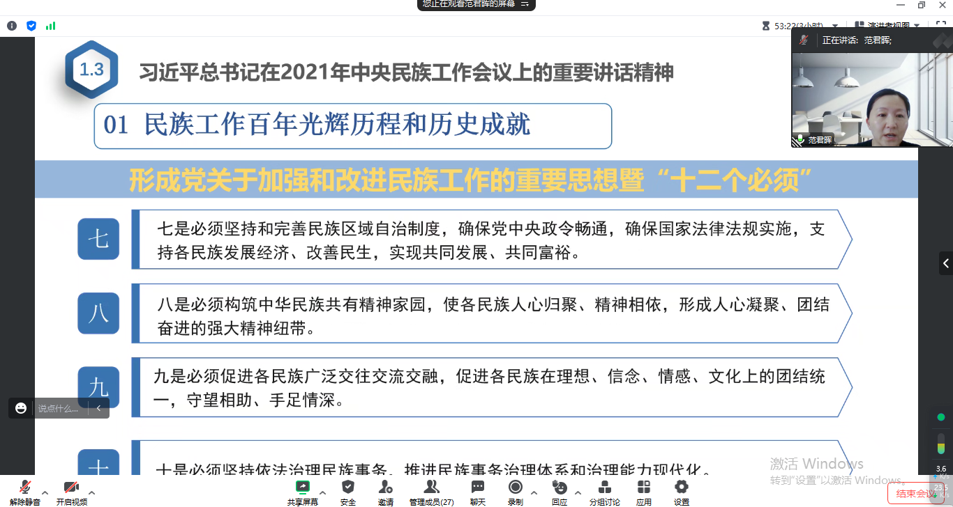会上,范君晖书记传达了公司民族宗教工作领导小组会议精神,并就2021年中央民族工作会议、全国宗教工作会议精神做了详细解读,介绍了中央民族工作会议、全国宗教工作会议基本情况及历次会议召开情况,并详细阐述了习近平总书记在会上的重要讲话精神,最后解读了一些制度文件中关于民族宗教工作的相关要求。范书记指出,通过专题学习,思政工作者和支部书记要更加深刻理解党的民族政策,积极引导广大师生铸牢中华民族共同体意识,科学认识民族宗教问题,不断提升在高校院系开展民族宗教工作的能力水平,团结广大师生一心为实现中华民族伟大复兴贡献新的更大的力量。