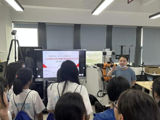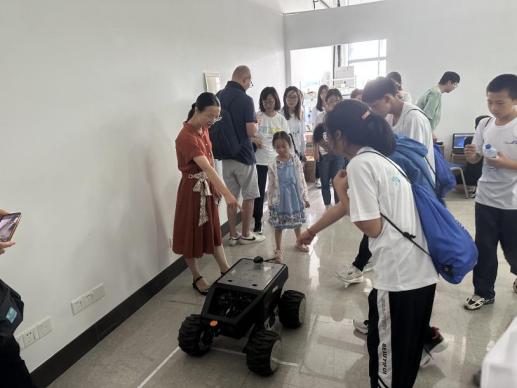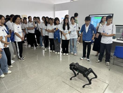 最后,在机器人实验室,胡凌燕教授带领同学们接触了仿生狗、智能小车、机械臂等最新的机器人领域的科技成果,并了解到了这些机器可以对目标进行导航定位、实施跟随等,在消防,巡检,医疗方面具有较强的实用价值。