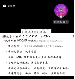 南开大学计算机科学与信息安全系的刘晓光教授,以“区块链技术与数字人民币”为主题,为在座师生带来了一场前沿科技的盛宴。刘晓光教授是该领域的“大咖”。不仅在学术研究方面有着深远的影响力,主持完成了多项国家课题,发表高水平论文100多篇,还与华为众多知名企业保持着长期紧密的合作关系,是国内外信息技术领域的著名学者之一。