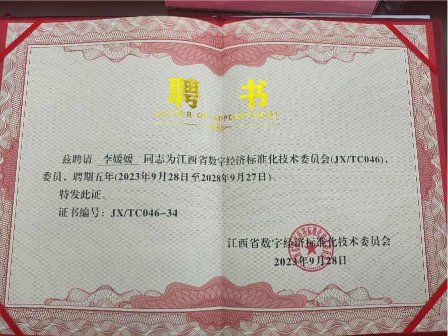10月11日,江西省数字经济标准化技术委员会成立大会在南昌召开,该标准化技术委员会作为数字经济领域标准化产学研相结合的重要工作平台,主要承担数字经济领域标准研制、征求意见、技术审查、复审等工作。公司李媛媛教授获聘江西省数字经济标准化技术委员。