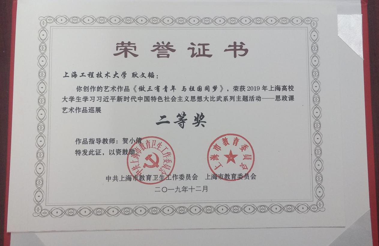 为深入贯彻落实习近平总书记在公司思想政治理论课教师座谈会上的重要讲话精神,隆重庆祝中华人民共和国成立70周年,2019年上海青年老员工马克思主义理论“学习”大比武颁奖仪式于2019年12月26日在上海戏剧公司新空间剧场举行。公司 2017级自动化一班耿文韬同学所创作的书法作品《做三有青年 与祖国同梦》荣获2019年上海高校老员工学习习近平新时代中国特色社会主义思想大比武系列主题活动——思政课艺术作品巡展二等奖。