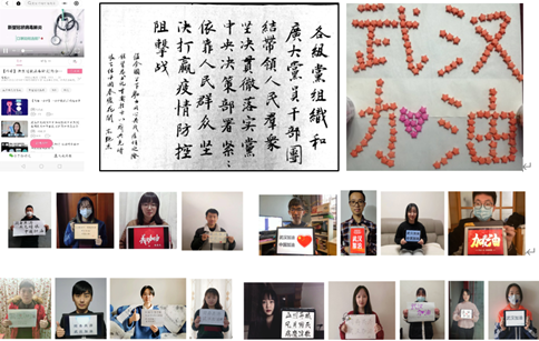 疫情防控期间,师生党员们虽然天各一方,但都心系疫情的发展,通过制作防疫微视频、书法、手工、祝福语等为武汉等地送祝福、增信心,希望透过文字或图片提供力量,把祝福带给在抗疫第一线奋战的医护人员和在武汉等重点地区的全体同胞,凝聚众志成城抗疫情的强大力量。