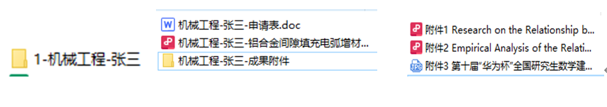 3)成果文件夹:学科或专业学位类别-姓名-成果附件。其中1项成果扫描为1个PDF文件,命名格式:附件序号-成果名称。内容以提交学位申请成果的要求为准。SCI、EI论文检索证明须放在该论文扫描件的第一页。