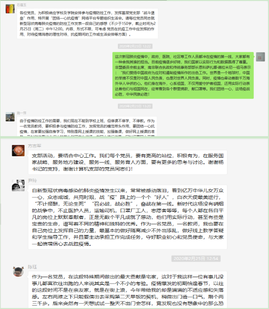 为积极响应公司及公司安排参与疫情防控工作,发挥基层党支部“战斗堡垒”作用,计算机系党支部于2月23日开展了“团结一心抗疫情”网络平台专题组织生活会。支部的每位党员就新型冠状病毒肺炎疫情的防控工作发表了一段自己的感想,内容涵盖了党员在抗疫工作中应发挥的作用、对待疫情消息的理性对待、抗疫期间的工作或生活安排等方面,并展开热烈的讨论。