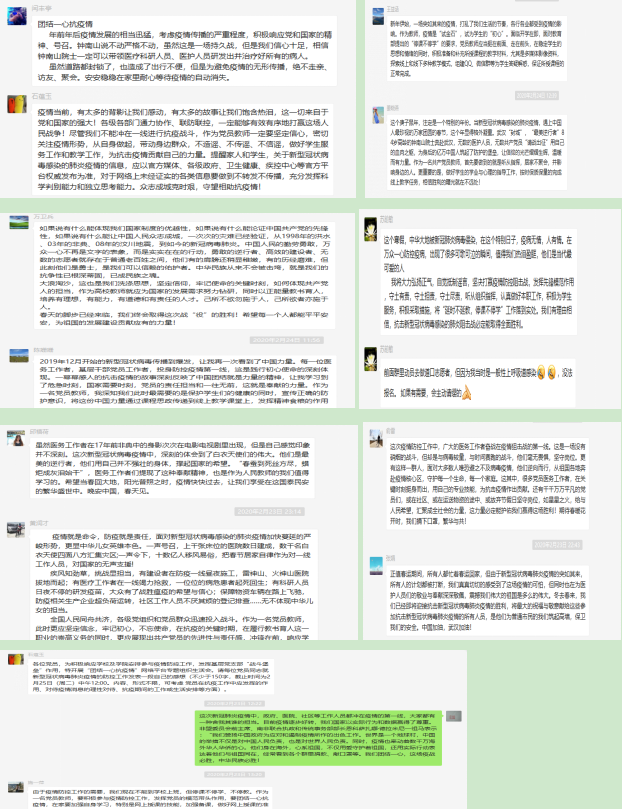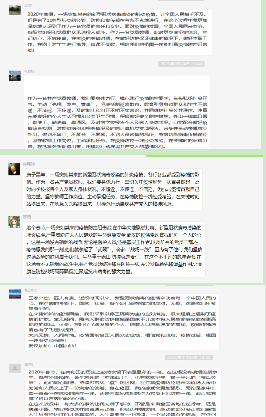 支部党员纷纷表达了对此次新冠肺炎疫情的关切以及对一线抗疫人员的敬佩,表达了对国家强大和责任担当的坚定信念,在这样的关键时刻共产党员一定要发挥模范作用并听从指挥,密切关注各级党组织的部署安排,身体力行、模范践行疫情防控要求,带头弘扬社会正气,主动“亮相、发声、管事”,坚决抵制谣言散布,教育引导身边群众和员工不信谣、不造谣、不传谣,及时制止和纠正不明不实言论,共同维护社会公共秩序。开学在即,面对教育部提出的“停课不停学”的要求,党员教师应当挺在前面、走在前头,在稳定员工的思想和情绪的同时,积极准备和补充所授课程的教学材料,尤其是多媒体影像资料,探索线上和线下多种教学模式,组建QQ、微信群等为员工答疑解惑,保证所授课程的正常完成。随后,支部党员在方志军经理的带领下,就如何发挥专业优势、如何运用人工智能和大数据等专业知识更好地服务疫情服务疫区等问题进行探讨,支部党员应该积极投入到服务国家战略、服务地方建设、服务一线、服务育人的工作中去。