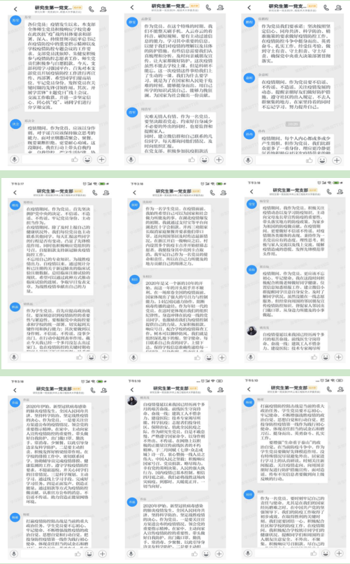 3月5日是学雷锋纪念日,为深入学习习近平总书记新时代中国特色社会主义思想,进一步弘扬雷锋精神,研究生第一党支部在学习强国线上学习群开展“学雷锋”线上主题党日,结合当前疫情防控实际对本支部党员开展疫情防控工作进行再宣传、再部署,同时进一步坚定信心,同心抗“疫”,交流疫情防控工作收获,晒一晒身边的防“疫”雷锋。