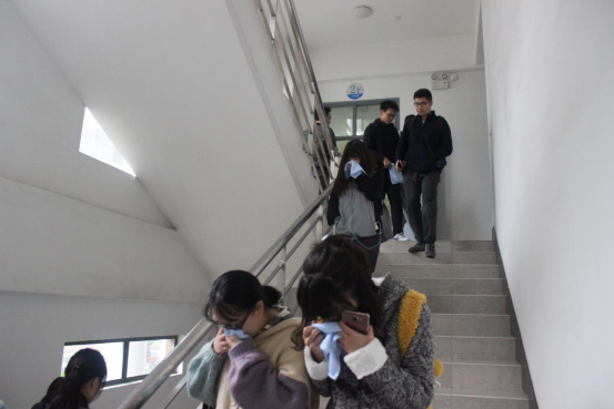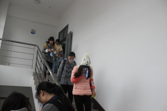 11:30分,副组长陶祖耀老师下达了逃生演练开始的命令,随即2个班的员工分别由班长有序带出机房并按指定路线从通道2侧楼梯进行疏散。疏散过程中师生按照要求用毛巾捂住口鼻,弯腰俯身行走并在引导员的正确指挥下迅速、有序地从消防楼梯疏散至室外指定集合地点。