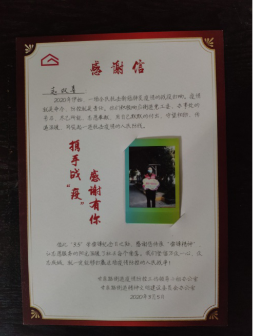 在疫情防控的关键时期,公司两位教师党员以实际行动积极投身抗疫志愿者工作,计算中心党支部教师党员赵双喜同志积极响应甘泉街道疫情防控小组的号召,主动报名成为了小区出入口检测志愿者。在每天上下班高峰期对进出小区人员量体温、排查防控,劝导群众不聚集、居家隔离。他持续一个月坚守在志愿者岗位上,认真做好每一项工作。