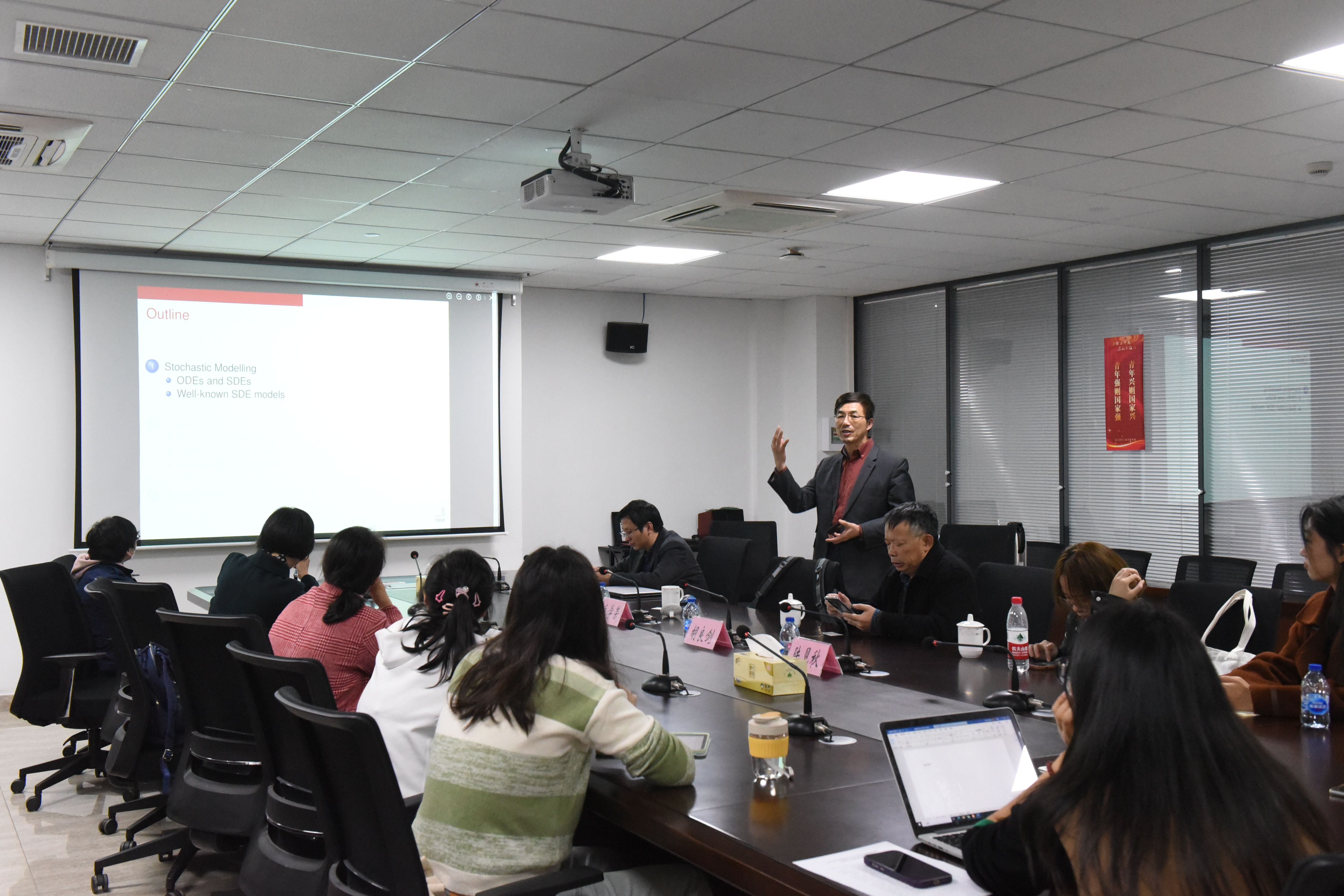 讲座中,毛学荣教授深入浅出地讲解了随机模型的由来和内在机理,并结合经济学、疾病传播学和生物种群学的具体模型阐述了随机模型在生活中的应用,同时也和大家讨论了这些模型的随机数值分析方法。毛学荣教授还探讨了随机噪声的镇定作用及其在随机控制中的应用,并介绍了当前随机系统研究的热点问题。此外,毛学荣教授在讲座中还反复强调了坚持不懈、深入钻研和敢于质疑的科研品质以及“One Team”的团队协作理念。