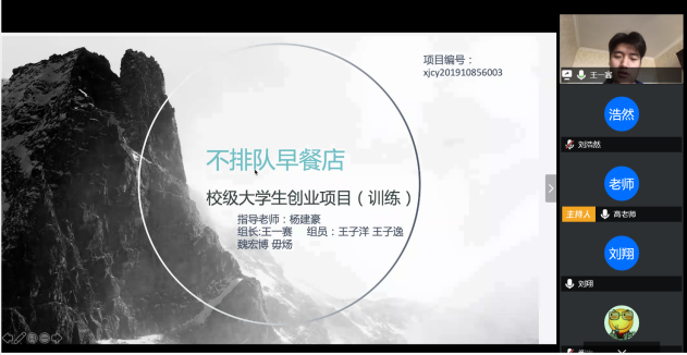 为了保障云端答辩会议的顺利进行,青年创业创业俱乐部提前一周积极组织、整理各项目答辩全套资料,提前发送各位评审老师,方便各位专家老师提前进行会前初审工作。在线上答辩过程中,各项目负责人主要通过PPT的形式,详细汇报了项目概况、项目发展、项目成果、以及总结反思等主要内容。根据同学的展示情况,评审老师就各项目组的项目开展情况给出了中肯的意见和材料完善建议,进一步指导和帮助各项目组做好项目的后期开展工作,延续创业实践校园影响力。