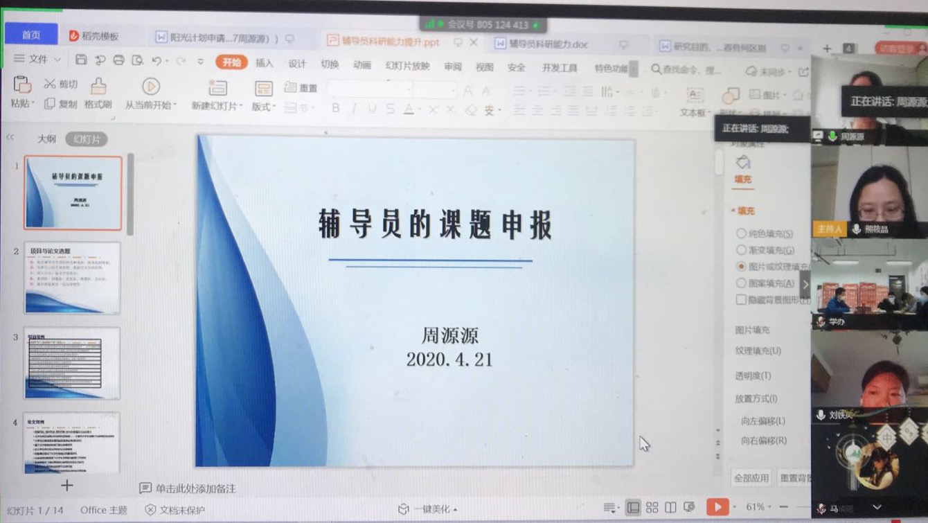 为提高辅导员科研能力,拓展公司辅导员思政视野,4月21下午,公司员工工作办公室邀请上海大学环境与化学工程公司党委副书记马成瑶老师、上海外国语大学档案馆、校史馆、语博馆副馆长周源源老师开展了以课题申报中主题的专题线上讲座。会议由公司党委副书记熊筱晶主持,全体辅导员参加了本次会议。