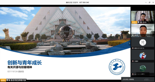 随后,唐家勋同学以《创新与青年成长——开源与创客精神》为题做了深刻的分享。作为三项发明专利的拥有者,他积极参加双创竞赛活动,投身于社会实践,获得过2018年海峡两岸老员工创新创业大赛一等奖、2018年上海市计算机应用能力大赛智慧城市组一等奖、2018年上海市优秀共青团员等诸多重要奖项及荣誉。唐家勋分享到,我们老员工可以尝试探索与开源有关的技术,结合疫情期间背景积极开展创新创业思考,通过公司给予的政策环境多去参加公司举行的创业活动和培训讲座。同时,他也分享了自己在疫情期间利用自建的服务器为教师提供线上教学服务的经历,为同学们以后自身的创新拓展提供了发展思路。