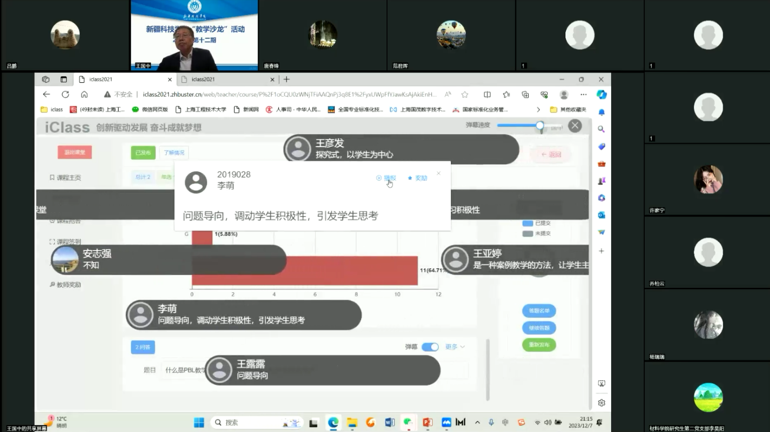 王教授结合自身经历和创新实践过程,详细介绍了数字赋能教学研究成果在教学中的应用转化、数字经济新基建及数字技术赋能公司产品改革的理念、方法和实践等内容。并通过运用王教授科技创新成果反哺教育成果——ICALSS智慧教学系统现场分享案例及互动环节探讨了如何培养个人的创新意识和能力,如何将创新精神、劳模精神、工匠精神和调查研究应用于创新实践中。