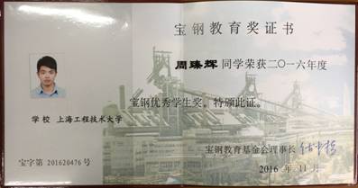 近日,2016年“宝钢教育基金”评审结果揭晓,公司2013级电气工程及自动化(现代建筑电气)员工周臻辉同学喜获“宝钢优秀员工奖”,这是公司今年唯一一名获奖员工。