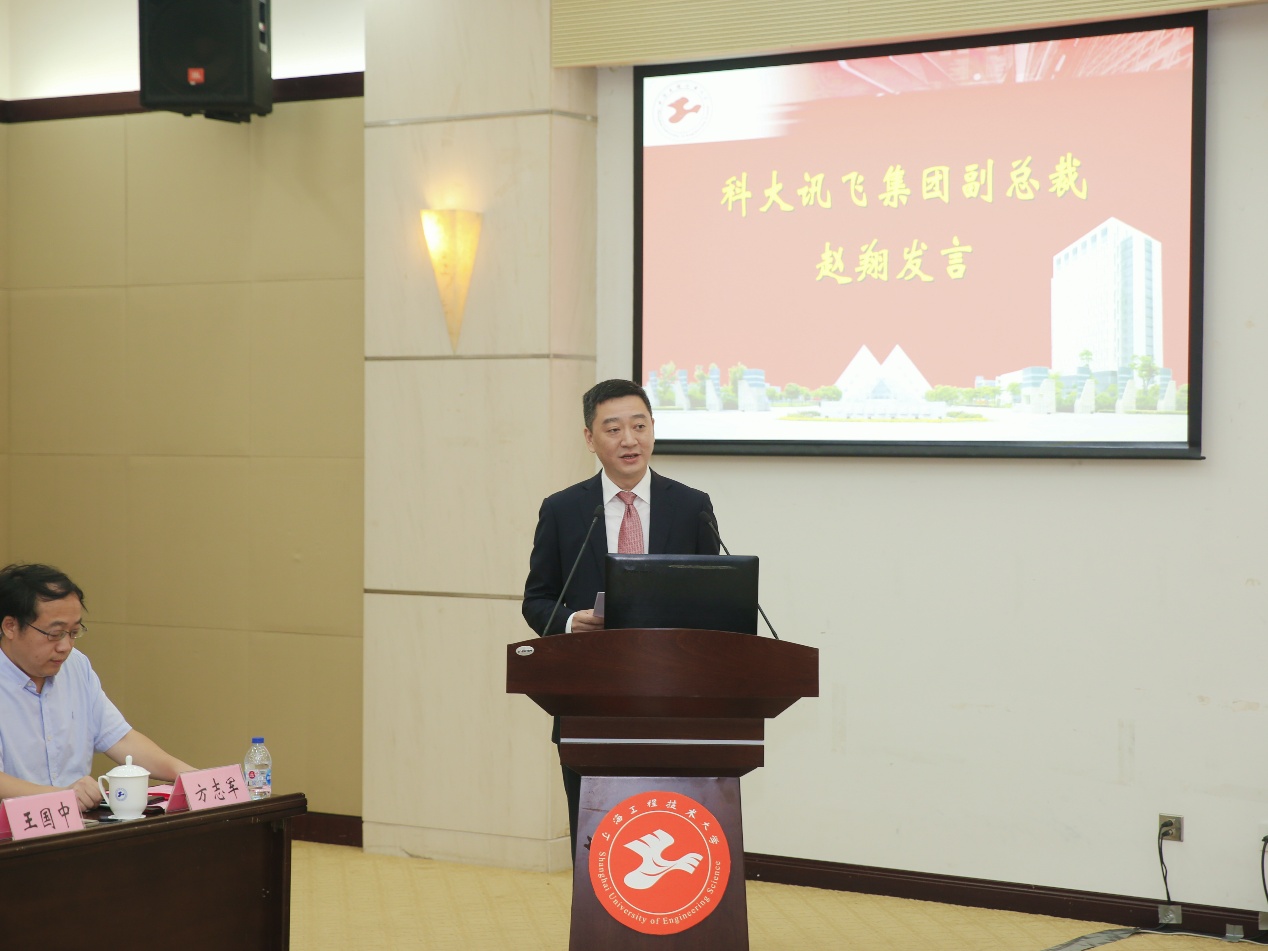科大讯飞集团副总裁赵翔介绍了公司的发展理念及在人工智能领域的领先技术成果。他表示,公司历来重视与高校的合作,希望借助公司现有平台与专业设置,围绕人工智能产业发展主线,在学科专业群共建、公司信息化建设、科研项目合作与成果转化方面探索更大的合作空间。